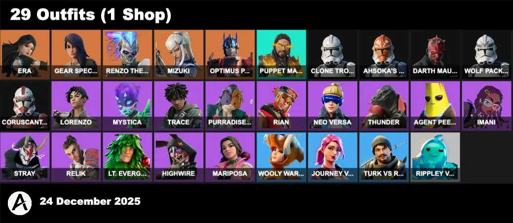 | PC/PSN/XBOX | 29 Skins | Puppet Master Robert | Era | Gear Specialist Maya | Renzo the Destroyer | Mizuki | Optimus Prime | Clone Trooper | Ahsoka's Clone Trooper | Darth Maul | Wolf Pack Trooper