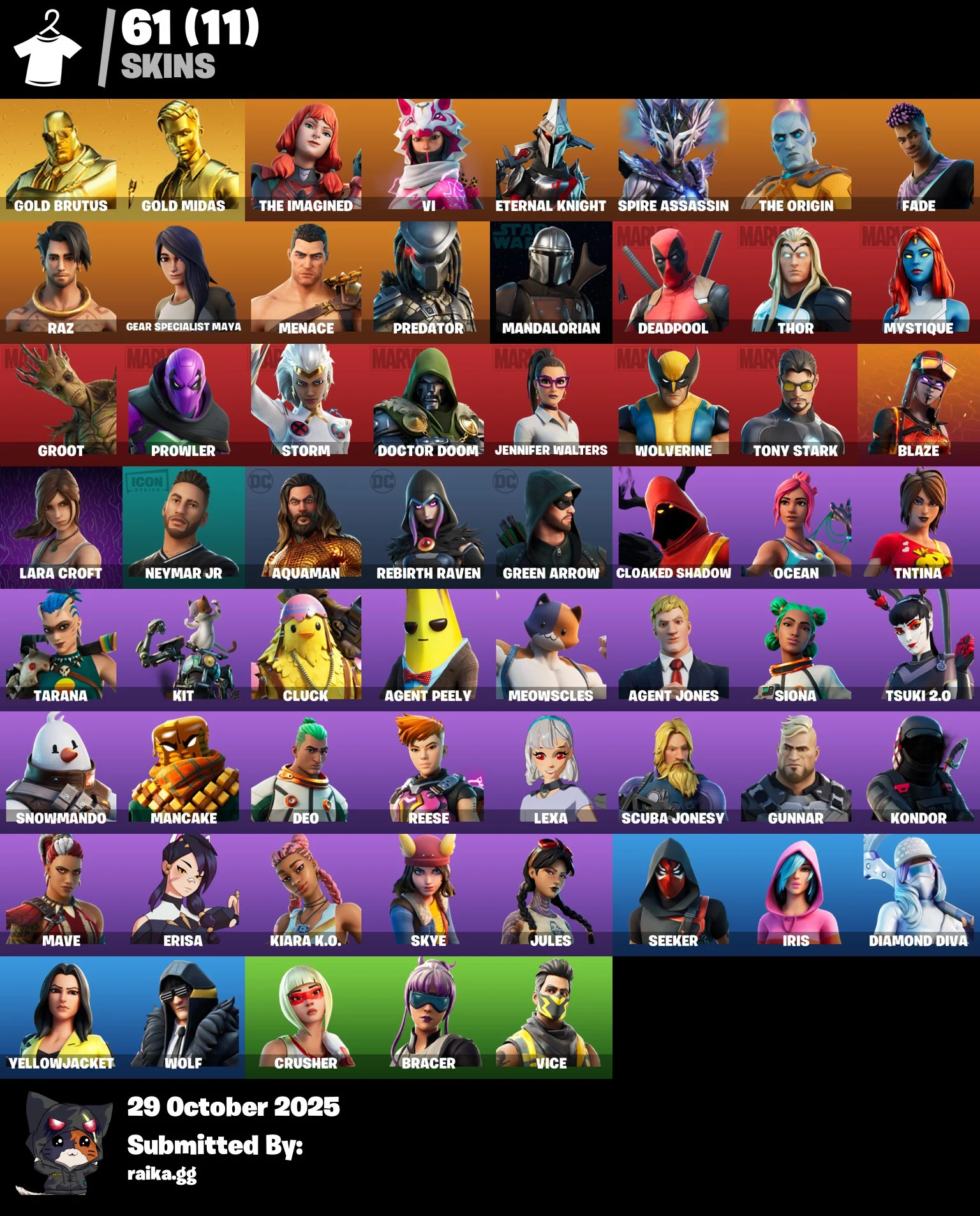 [PC/PSN/XBOX] 61 skins | Gold Brutus | Gold Midas | The Imagined | Vi | Eternal Knight | Spire Assassin | The Origin | Fade | Raz | Gear Specialist Maya | 700 VB