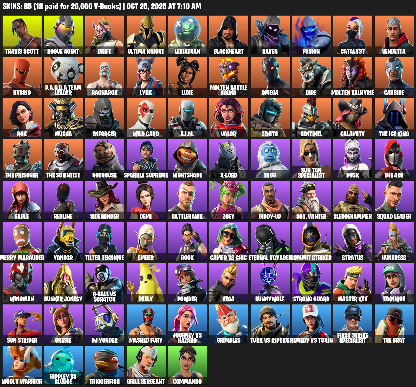 [PC/PSN/XBOX] | 85 skins | Travis Scott | Omega | Rogue Agent | Drift | Ultima Knight | Leviathan | Blackheart | Raven | Fusion | Catalyst | S4G