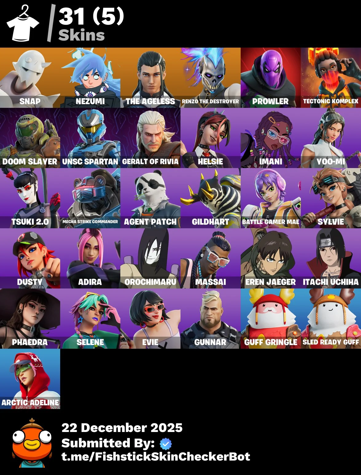 [PC/PSN/XBOX/]Changeable Mail | ITachi | Orochimaru | Eren Yager | 31 skins | Snap | Nezumi | The Ageless | Renzo the Destroyer | Prowler | Tectonic Komplex | Doom Slayer | UNSC Spartan | Geralt of Rivia | 100 VB