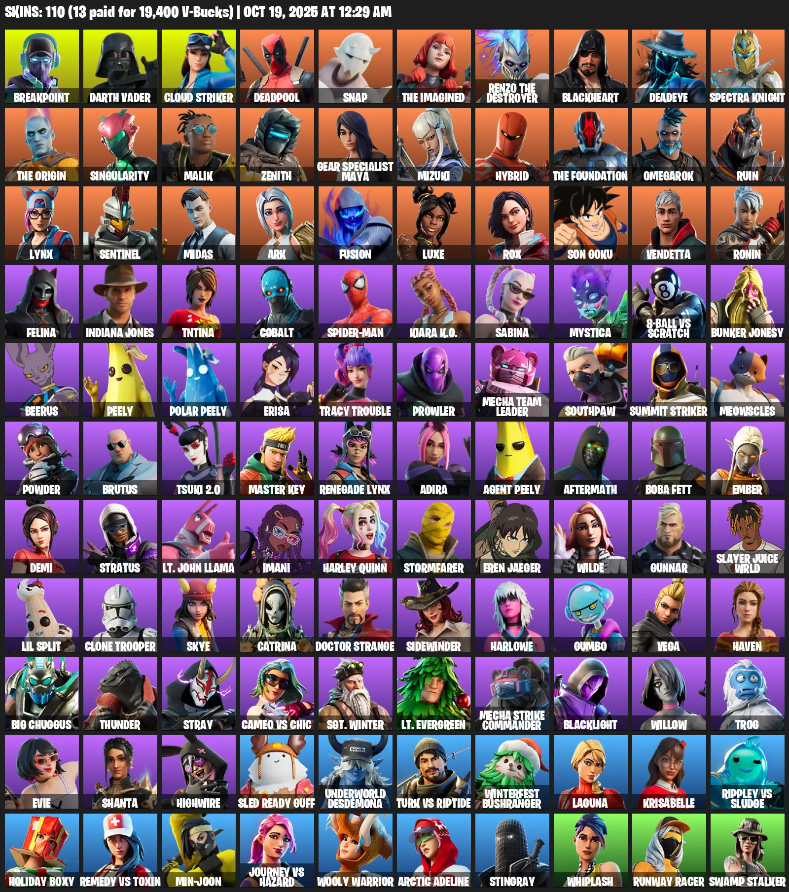 [PC/XBOX] 110 Skins | Breakpoint | Darth Vader | Cloud Striker | Deadpool | Snap | The Imagined | Renzo the Destroyer | Blackheart | Deadeye | Spectra Knight | The Origin | Singularity | Malik | Zenith | Gear Specialist Maya | Mizuki | Hybrid