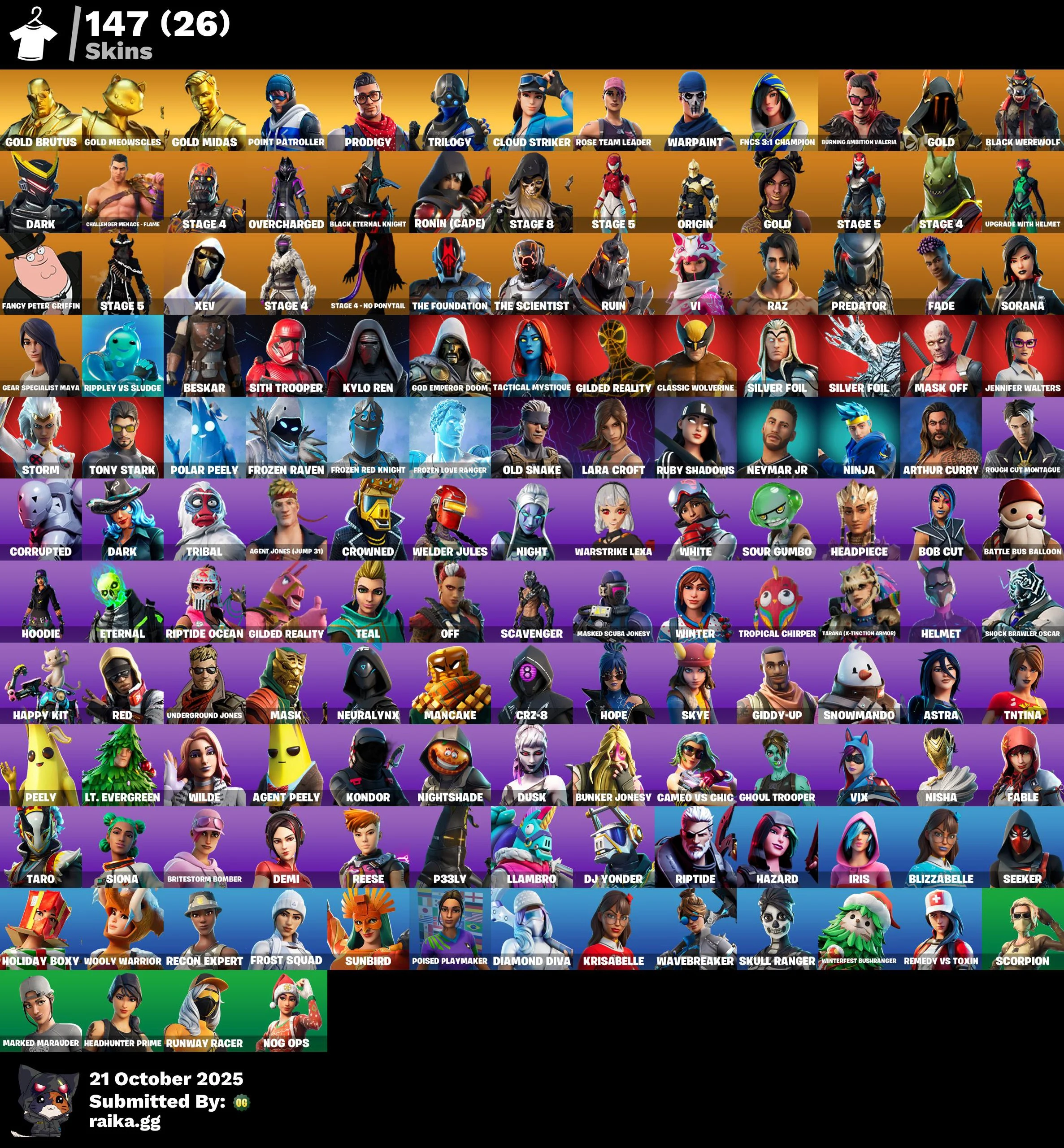 [PC/XBOX] 147 skins | OG STW | Lara Croft | Ghoul Trooper | Tony Stark | Peely | Star Wand | Sith Trooper	Mam39