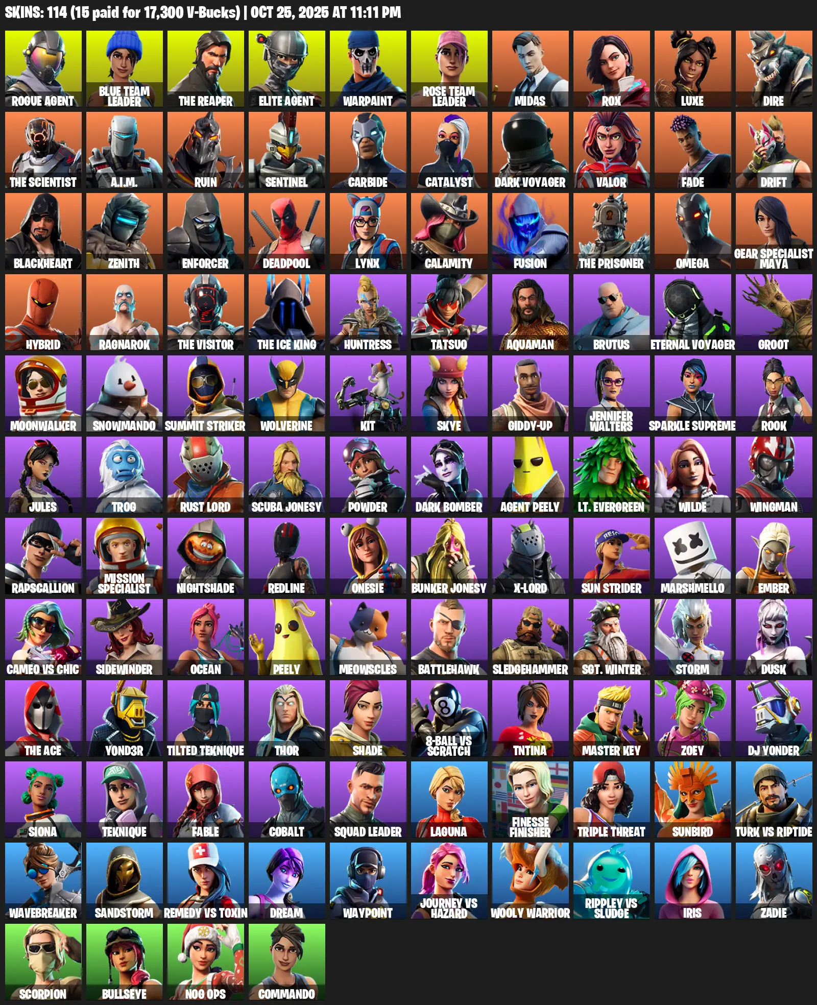 [PC/XBOX/PSN] 114 Skins | Rogue Agent | Blue Team Leader | The Reaper | Elite Agent | Warpaint | Rose Team Leader | Midas | Rox | Luxe | Dire | The Scientist | A.I.M. | Ruin | Sentinel | Carbide | Catalyst | Dark Voyager | Valor | Fade | Drift