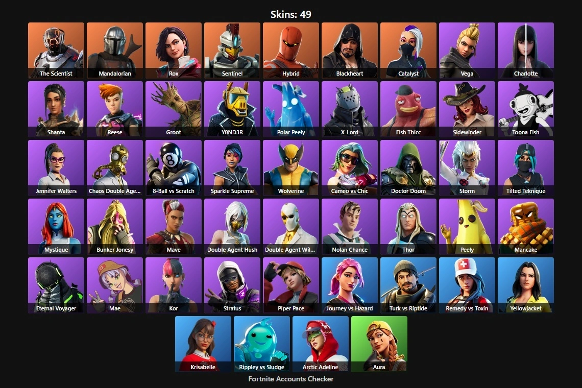 PC/XBOX/PSN 49 Skins⭐️ | Peely | The Scientist | Mandalorian | Rox | Sentinel | Hybrid | Blackheart | Catalyst | Vega | Charlotte | Shanta | Reese | Groot