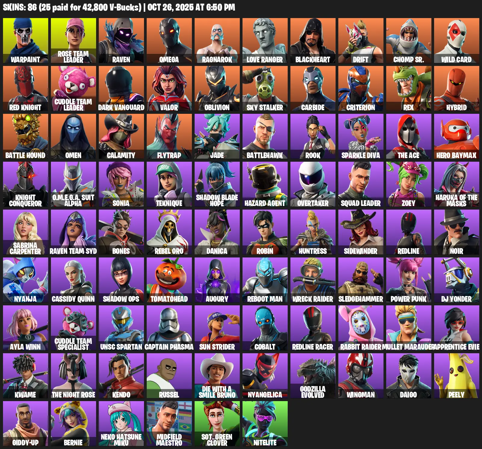 [PC/XBOX/PSN] 86 Skins | Warpaint | Rose Team Leader | Raven | Omega | Ragnarok | Love Ranger | Blackheart | Drift | Chomp Sr. | Wild Card | Red Knight | Cuddle Team Leader | Dark Vanguard | Valor | Oblivion | Sky Stalker | Carbide | Criterion | Rex