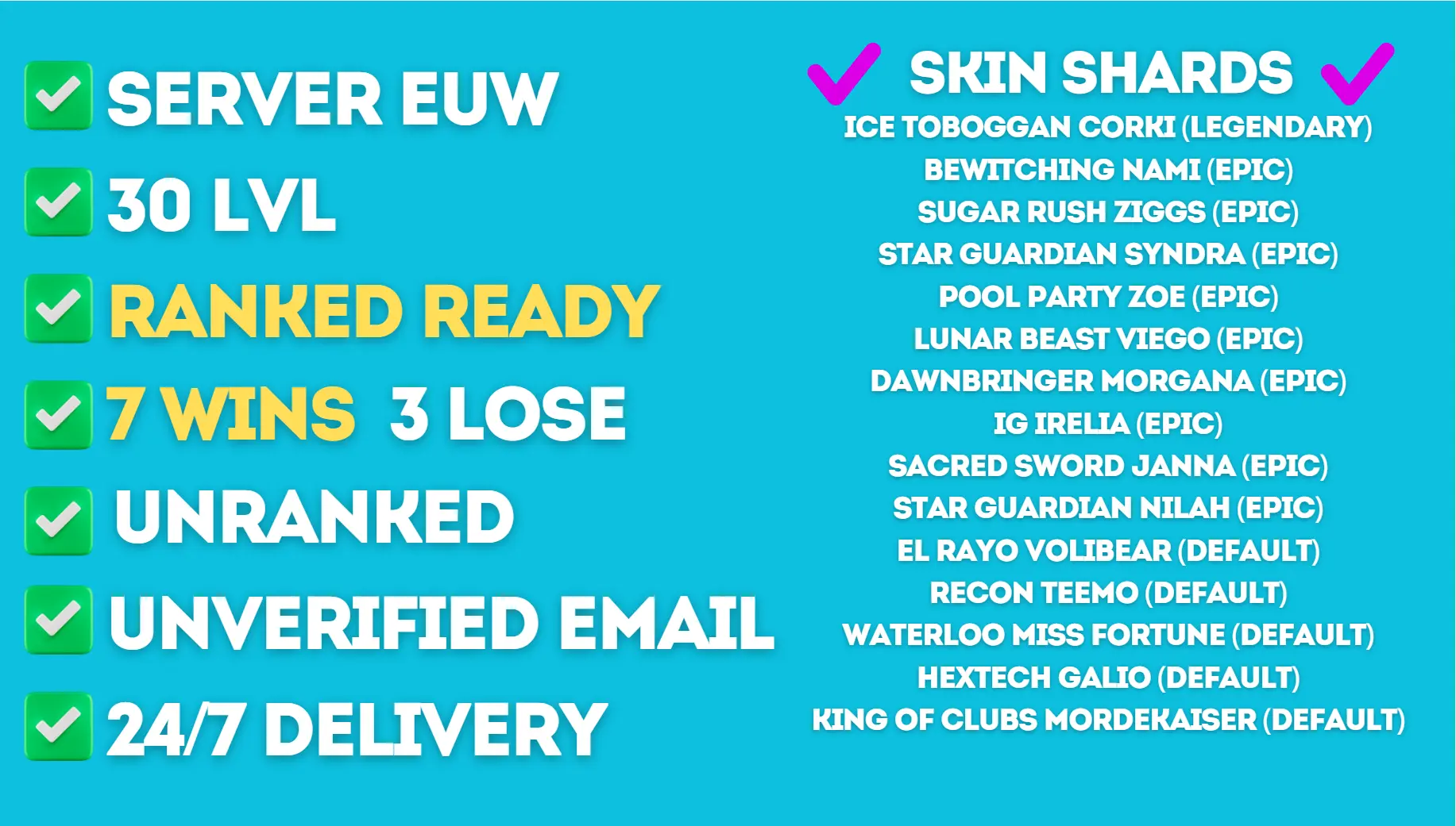 EUW 30 LvL ✅ Ranked Ready ✅ BE: 59340 ✅ Unverified ✅ Unranked ✅ Shards: Ice Toboggan Corki, Bewitching Nami, Sugar Rush Ziggs, Star Guardian Syndra, Pool Party Zoe, Lunar Beast Viego, Dawnbringer Morgana, iG Irelia, Sacred Sword Janna, Star Guardian Nilah