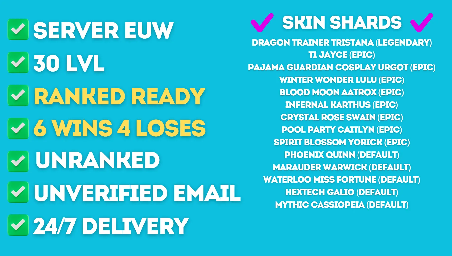 EUW 30 LvL ✅ Ranked Ready ✅ BE: 70520 ✅ Unverified ✅ Unranked ✅ Shards: DRAGON TRAINER TRISTANA, T1 JAYCE, Pajama Guardian Cosplay Urgot, Winter Wonder Lulu, Blood Moon Aatrox, Infernal Karthus, Crystal Rose Swain, Pool Party Caitlyn