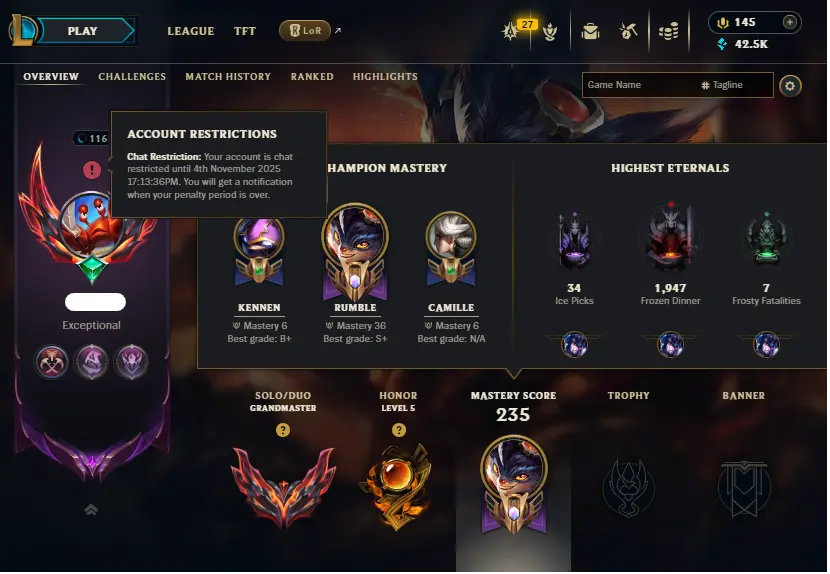 HUGE SALE!🔥LVL116 Grandmaster 675LP 61%WR Handleveled💎42K BE 73Champs 13Skins⭐Master Rewards✅Lifetime Ownership Guarantee ⸱ Never Taken Back