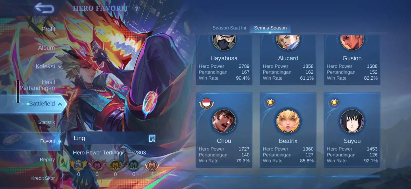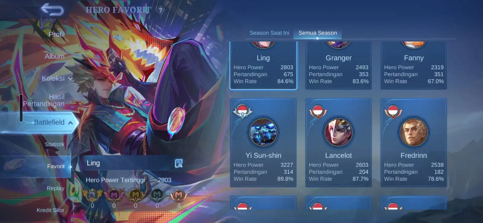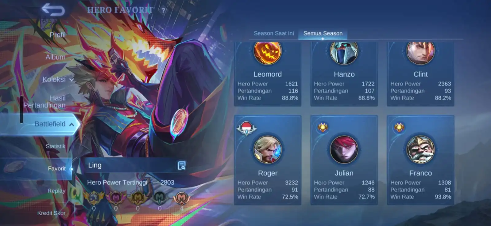 Ex Immortal 121 / Win Rate 70-90 % / Skins 250 [ Legend Granger ] Aspirants Fanny / Metrozero Roger / Neobeast Ling / Sasuke Suyou x Kakashi Hayabusa / KOF Gusion / Sanrio Floryn / Recall Onic PH x Recall Metrozero