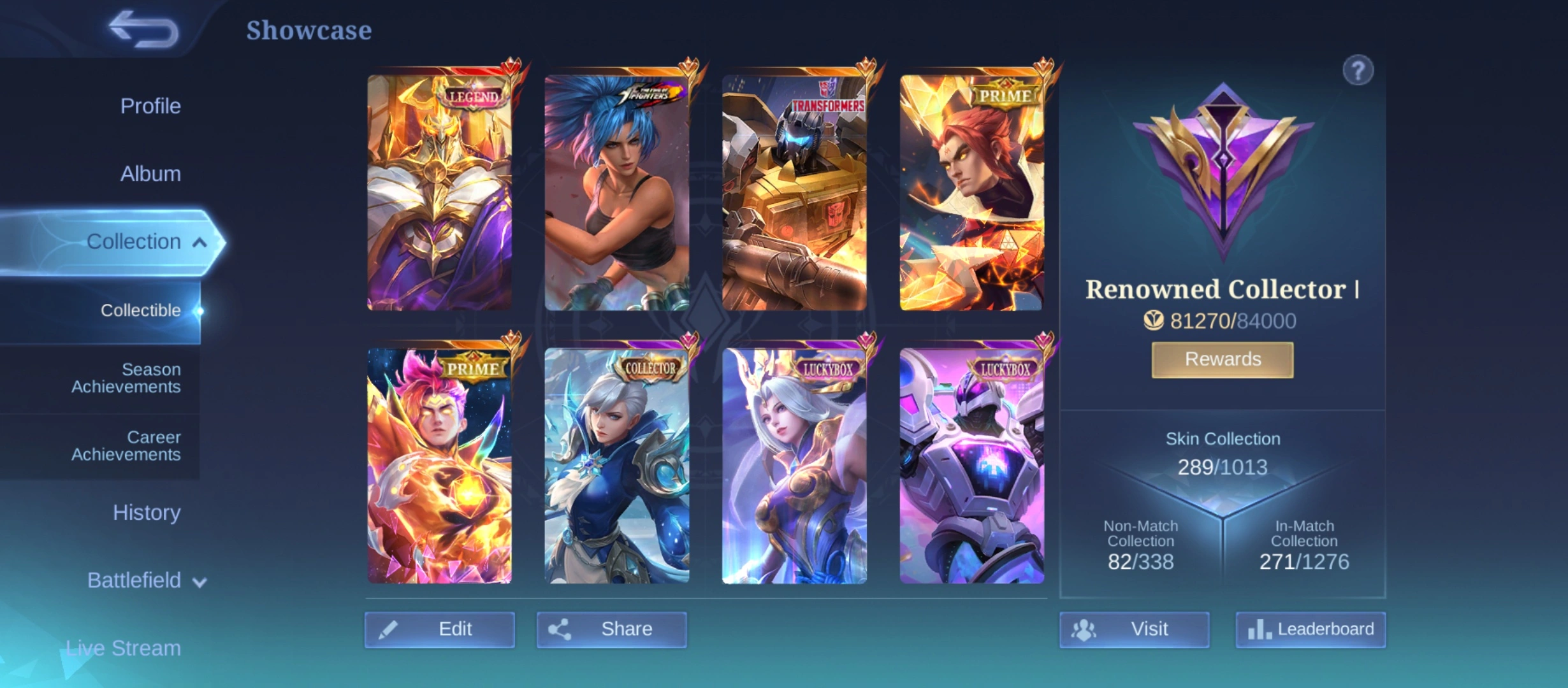 GG808|Lvl 82|RENOWNED CC 1|ALL EMBLEM MAX|289 SKIN|JOHNSON LEGEND|2 PRIME(CLAUDE,YU ZHONG)|2 COLLECTOR|SILVANNA COLLECTOR|ROGER TRANSFORMER|2 LUCKYBOX
