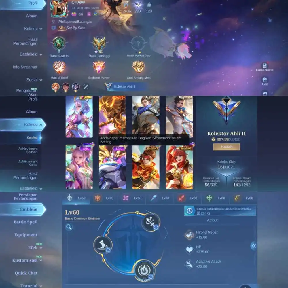 IT 750🔥MOBILE LEGEND🔥EMBLEM ALL MAX🍀11 EPIC🍀2 LIGHTBORN🍀1 LUNAR FEST🍀RANK:EPIC🍀HERO 88🍀SKIN 161(SAFE ACCOUNT)