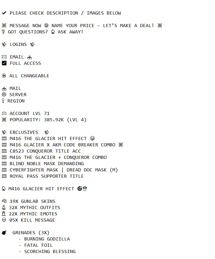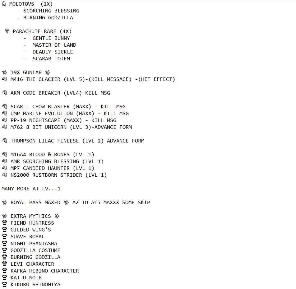 🎮 ACC LVL 71 👑 M416 GLACIER HIT EFFECT (Lvl 5) 🔫 AKM CODE BREAKER 💥 19X GUNLAB 💀 5X KILL MESSAGES ⚔️ COMBO 🏆 CONQUEROR 💣 GERNADE MOLEE 🔥 RARE EMOTES 🎭 MYTHICS 💎 HELMETS 🪖 BACKPACKS 🎒 PARACHUTES 🪂 GLIDERS ✨ SECURE 🔐