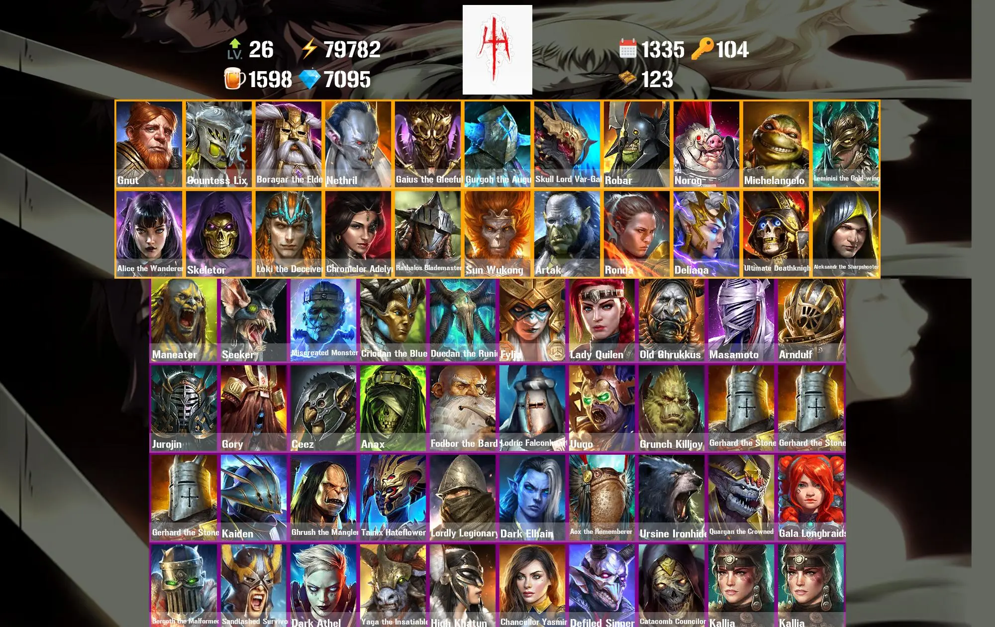 1335 Days 79.8k Energy Gnut ⸱ Countess Lix ⸱ Boragar the Elder ⸱ Nethril ⸱ Gaius the Gleeful ⸱ Maneater ⸱ Seeker ⸱ 50.4m Silver ⸱ 7.1k Gems