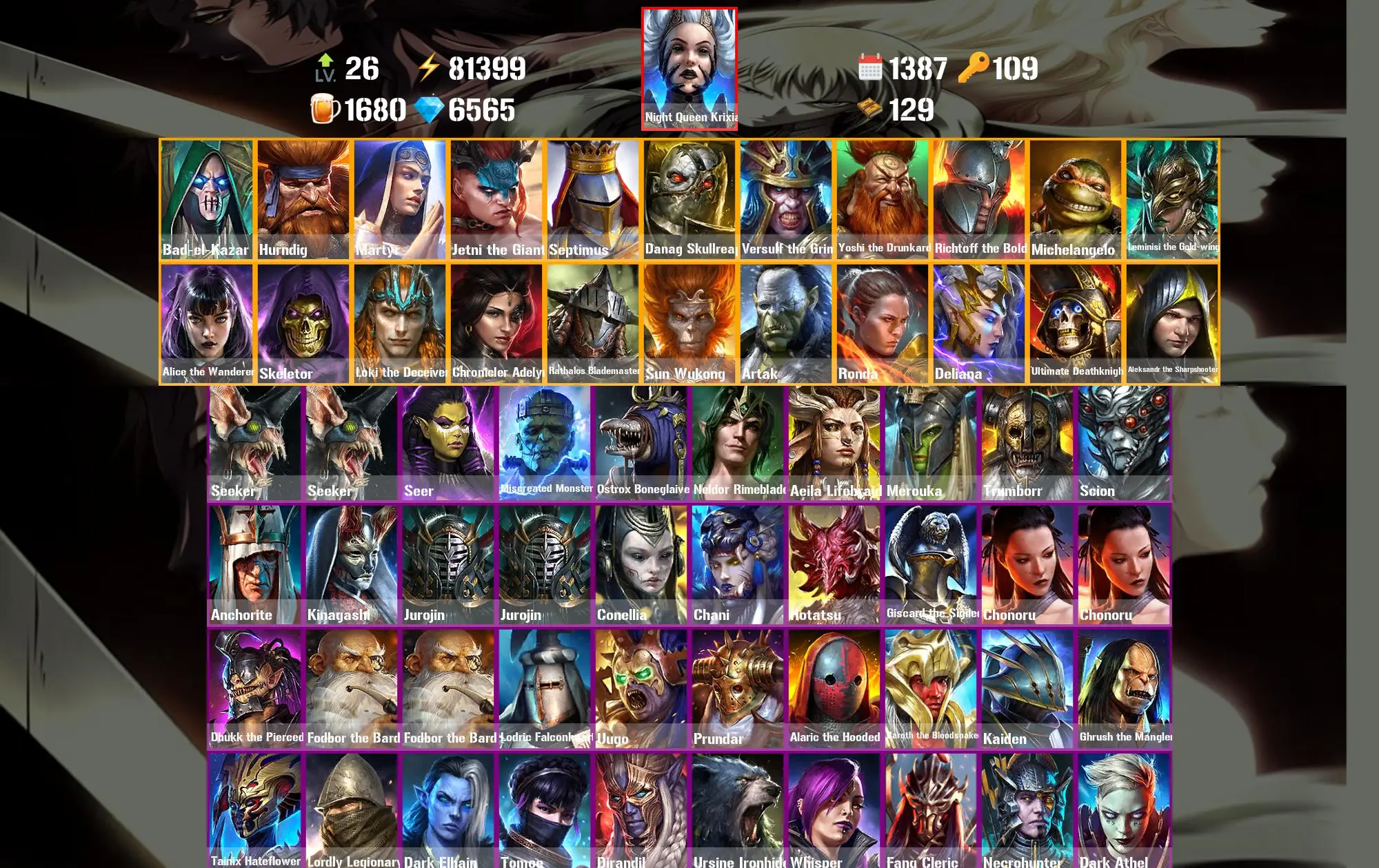1387 Days 81.4k Energy [Mythical Starter] Night Queen Krixia ⸱ Bad-el-Kazar ⸱ Hurndig ⸱ Martyr ⸱ Jetni the Giant ⸱ Septimus ⸱ Seeker ⸱ Seeker ⸱ 52.2m Silver ⸱ 6.6k Gems