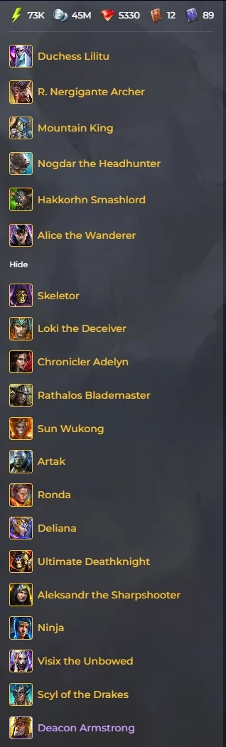 🔥Days:1220+🔥R. Nergigante🔥Lilitu🔥19 Legendary🔥60 Epic🔥73k Energy🔥45m Silver-5330 Gems-Mountain King-Nogdar-Hakkorhn-Ninja-Deacon-A74DM18