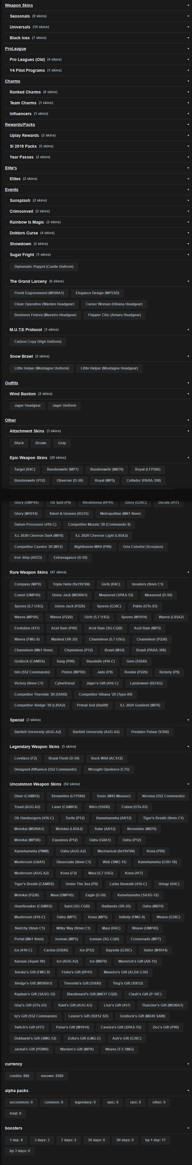 / | PC|PSN|XBOX | 2x Gold & 5x Silver | Lvl 196 | Ranked Ready | 61 Operators | 7x Black Ice | 10 Universal Skins | 5 Pro League Sets | 2 Elite | 8580Renown |