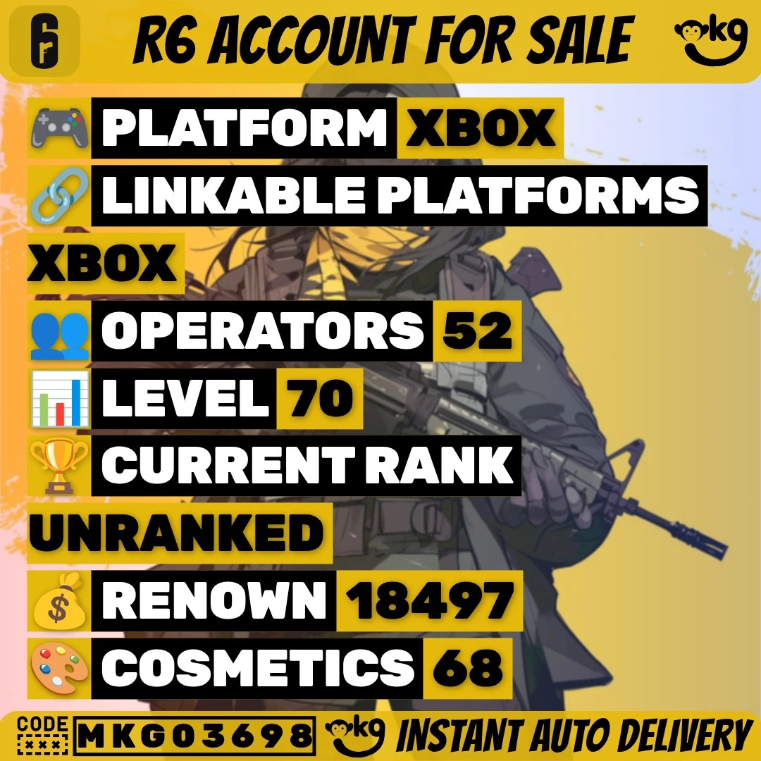 🚀 【 XBOX 】 Level 70 ✅ 3 BLACK ICE + 65 SKINS + Unranked ✅ 52 OPERATORS + 💰 18,497 Renown + ⚡ Ready Ranked + 🔓 Full Access !MKG03698