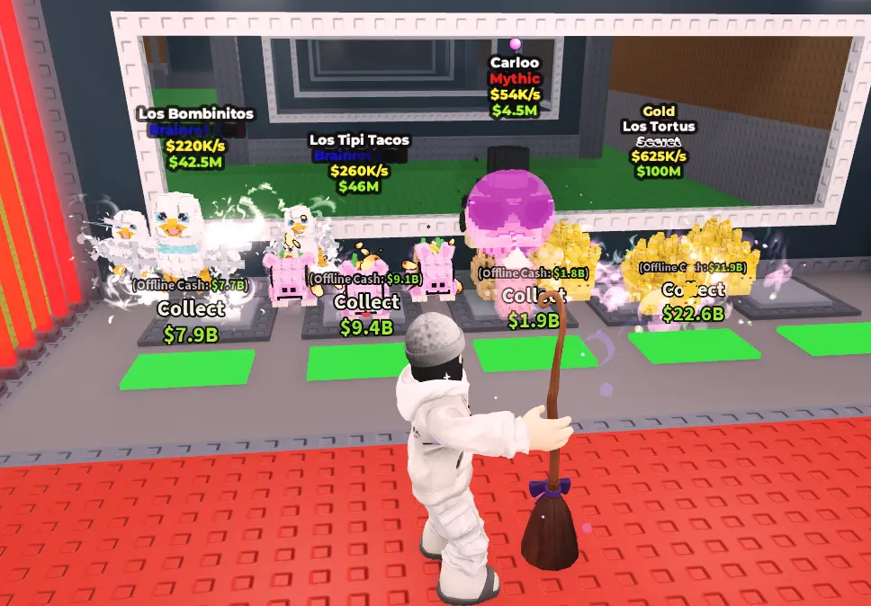 Rebirths 13, 9 Brainrtos, 5 Secrets, Lava & Rainbow & 2 Gold & 1 Diamond, Flying Carpet Owned, BlackHole Slap, Witch's Broom, Adopt me 11 pets