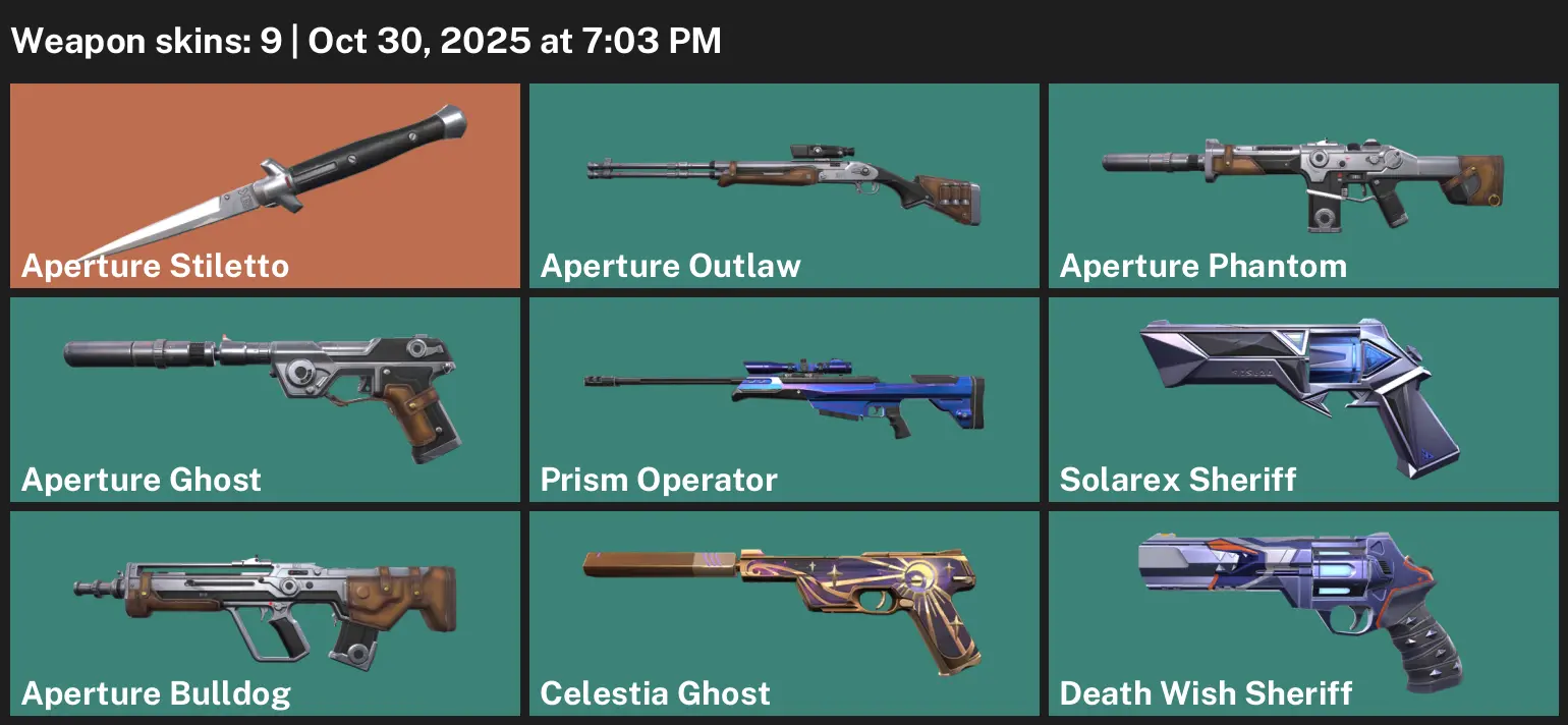 EU | 9 Skins | exp SILVER 2 | Aperture Stiletto | Aperture Outlaw | Aperture Phantom | Aperture Ghost | Prism Operator | #MOE1970 | #MBFN