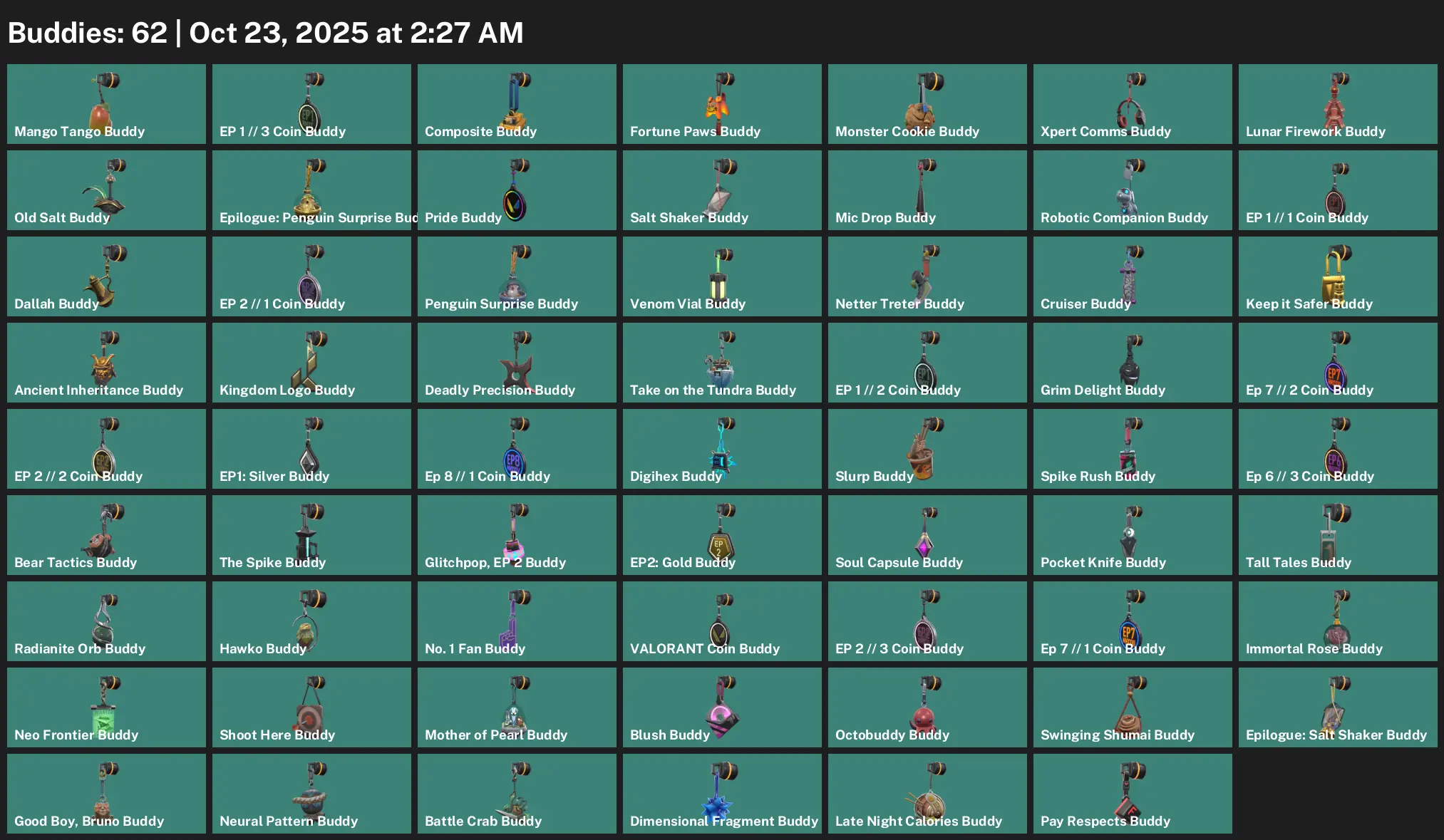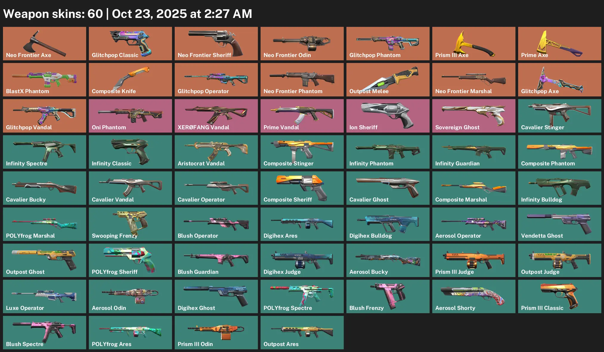 🍞 NA 🍫 Unranked 🤹♀️ 60 Skins 🐾 444 VP 🍈 18 Agents 🙉 Value: 42850 VP 🦑 Neo Frontier Axe 🦵 Glitchpop Classic 💻 Neo Frontier Sheriff 🥝 Neo Frontier Odin 😇 Glitchpop Phantom ⛩ Prism III Axe