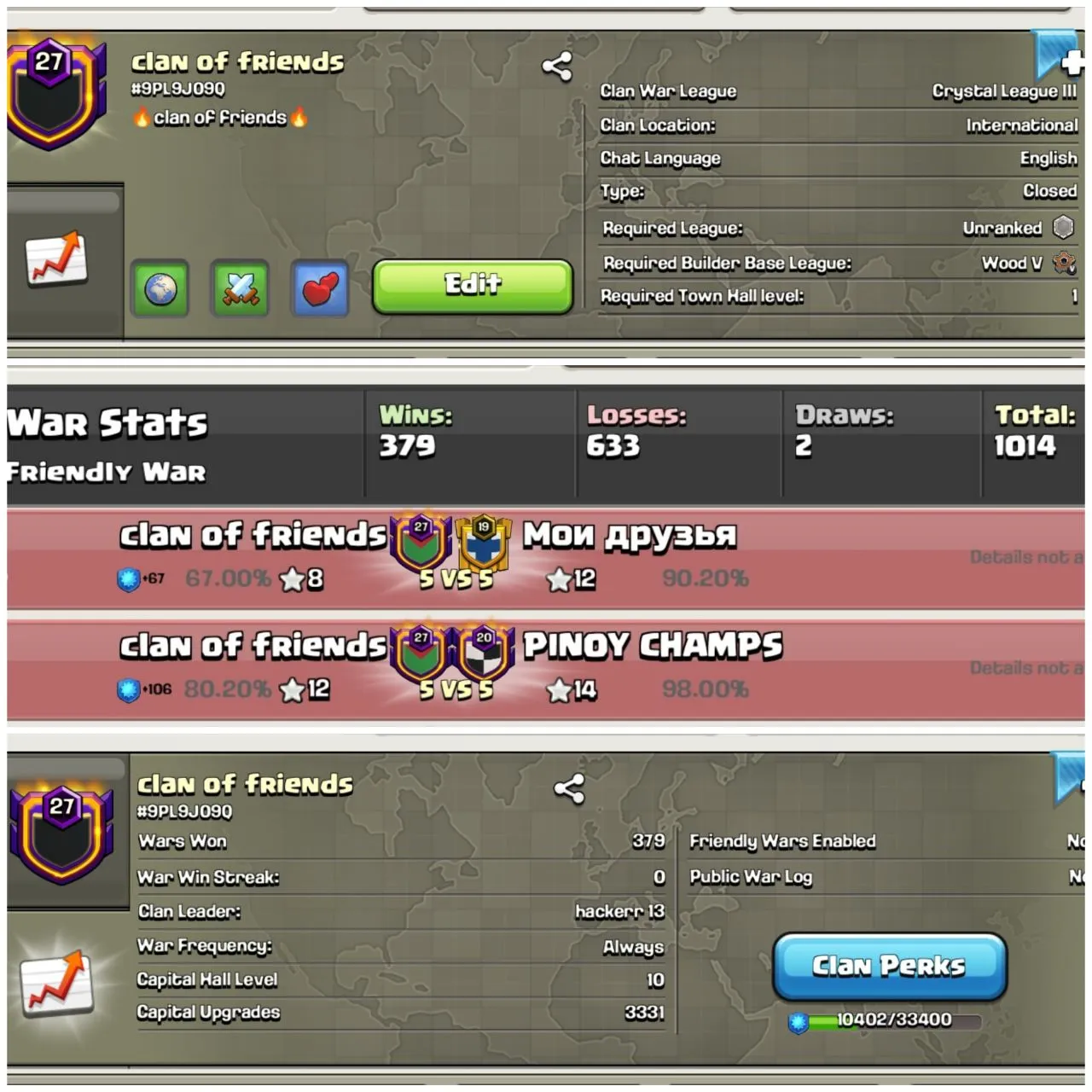 ⭐ NAME - clan of friends ⭐ LEVEL 27 ⭐ CRYSTAL 3 ⭐ CC 10 MAX ⭐ 379 : 633 WAR LOG ⭐ INTERNATIONAL CLAN ⭐ CHEAP DEAL ⭐ INSTANT DELIVERY ✅
