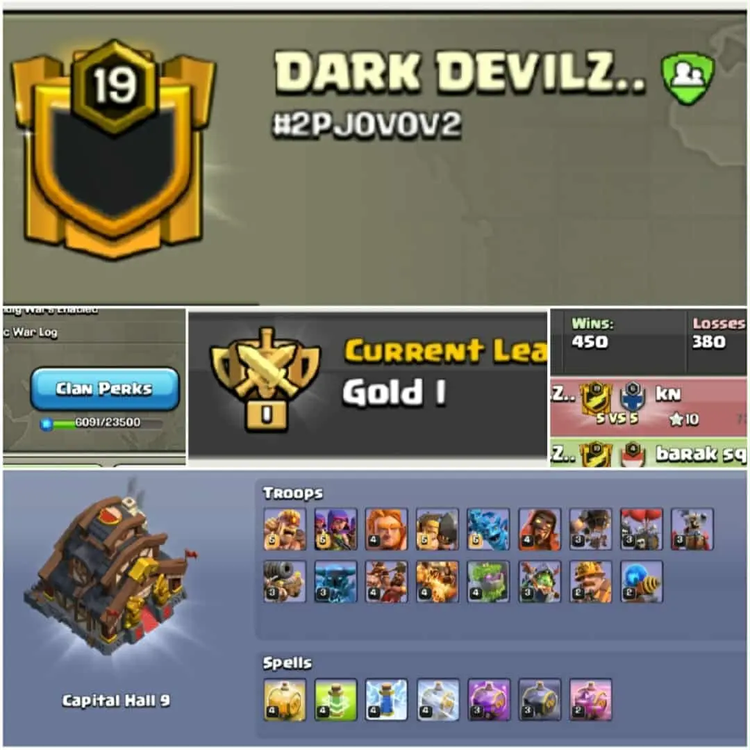 Clan Name:DARK DEVILZ🔥 Lvl :19+ 🔥Gold 1🔥 Capital hall 9 🔥Win 450 -- Loss 380🔥Good Name 🔥Fast delivery🔥Troops max