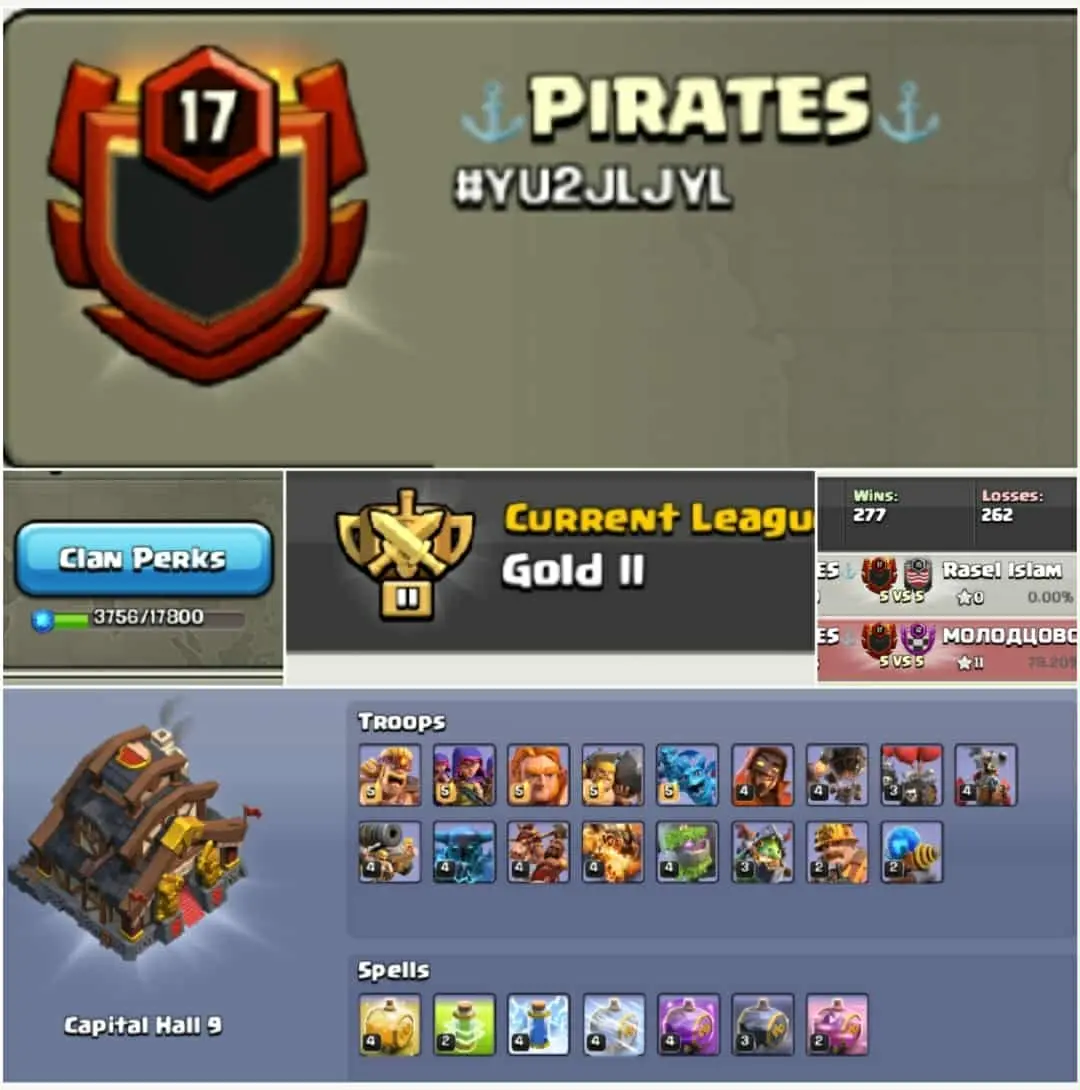 Clan Name: PIRATES🔥Lvl - 17+🔥Gold 2🔥Capital hall 9🔥Win 277 -- Loss 262🔥Rear Name🔥Fast delivery🔥Troops max