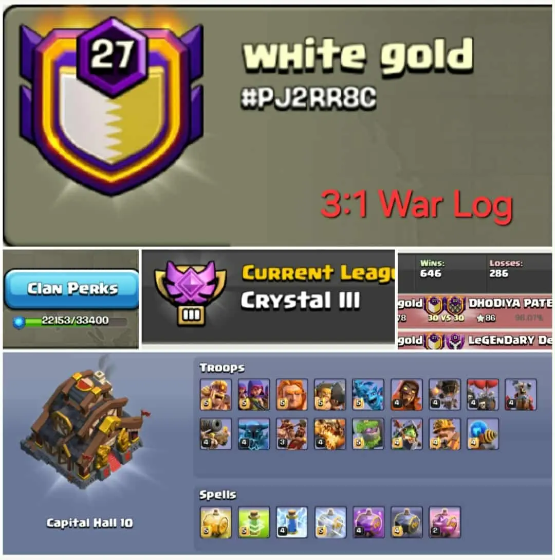 3:1 War Log🔥 Name: White Gold 🔥Lvl - 27+🔥Crystal 3🔥Capital hall 10🔥Win 646 -- Loss 286🔥Good Name🔥Fast delivery