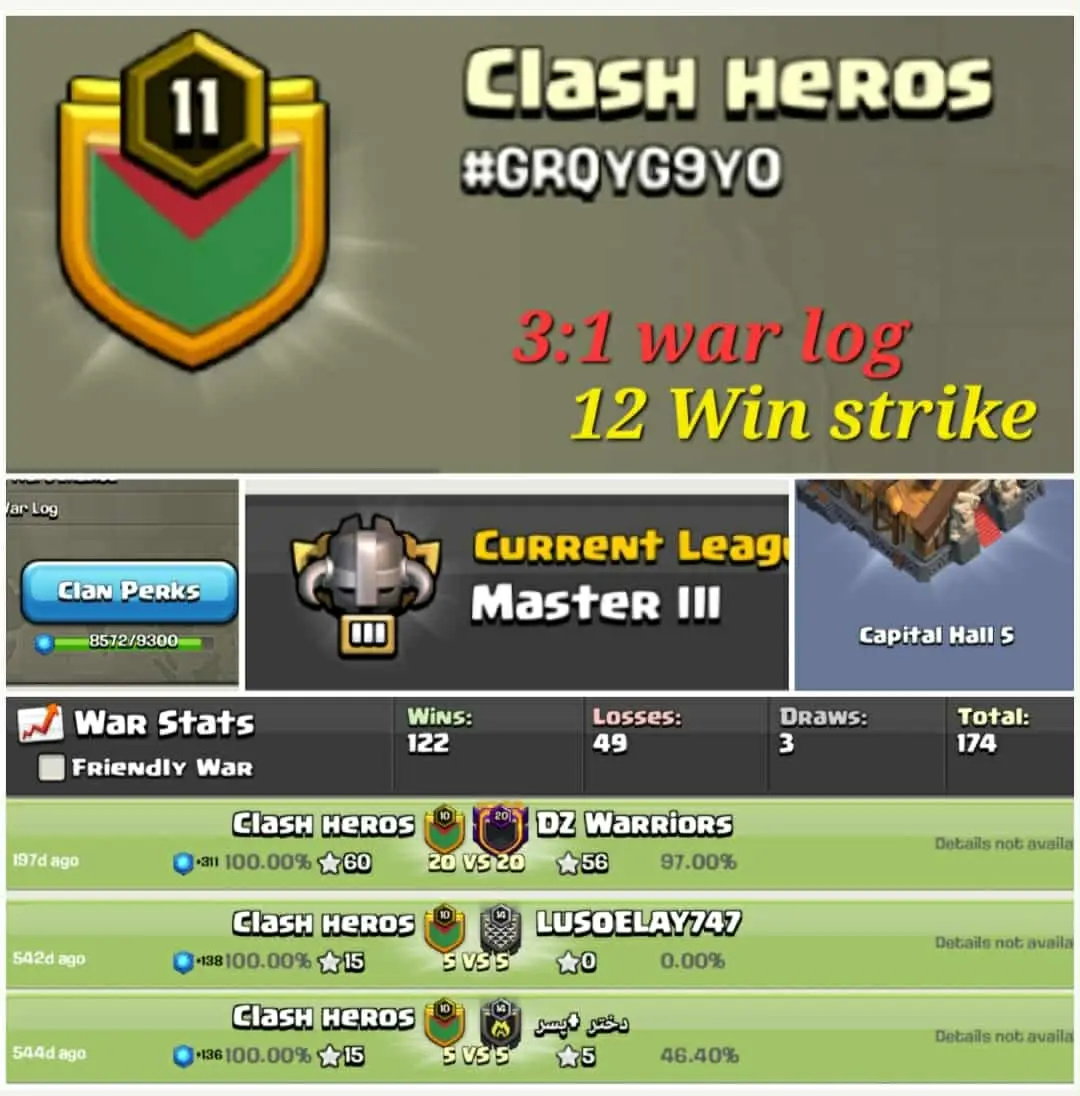 12 Win strike🔥3:1 War Log🔥Name : Clash Heros🔥Clan LvL- 11🔥Master 3 -- Win- 122 -loss- 49🔥Capital hall 5
