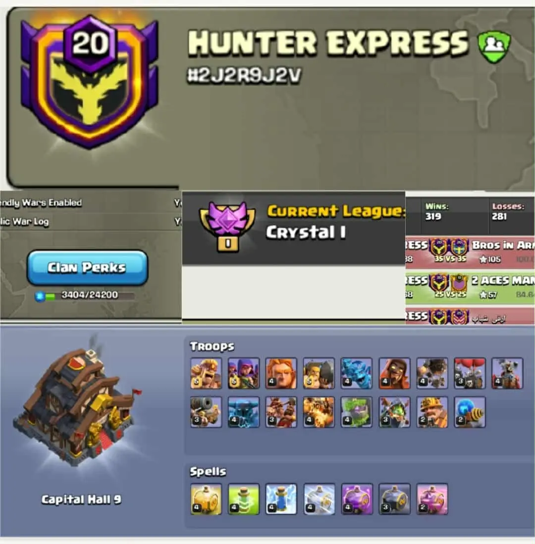 Clan name:HUNTER EXPRESS🔥Clan LvL- 20+🔥Crystal 1🔥Capital hall- 9🔥Win- 319 _loss- 281🔥Capital Troops Max🔥