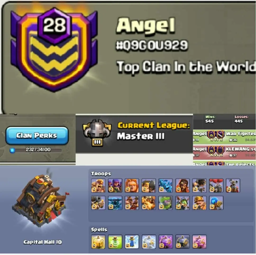 Clan name- Angel🔥Clan LvL- 28+🔥 Master 3🔥Capital hall- 10🔥Win- 545 _ loss- 445🔥Full Troops max🔥 3331 Upgrade