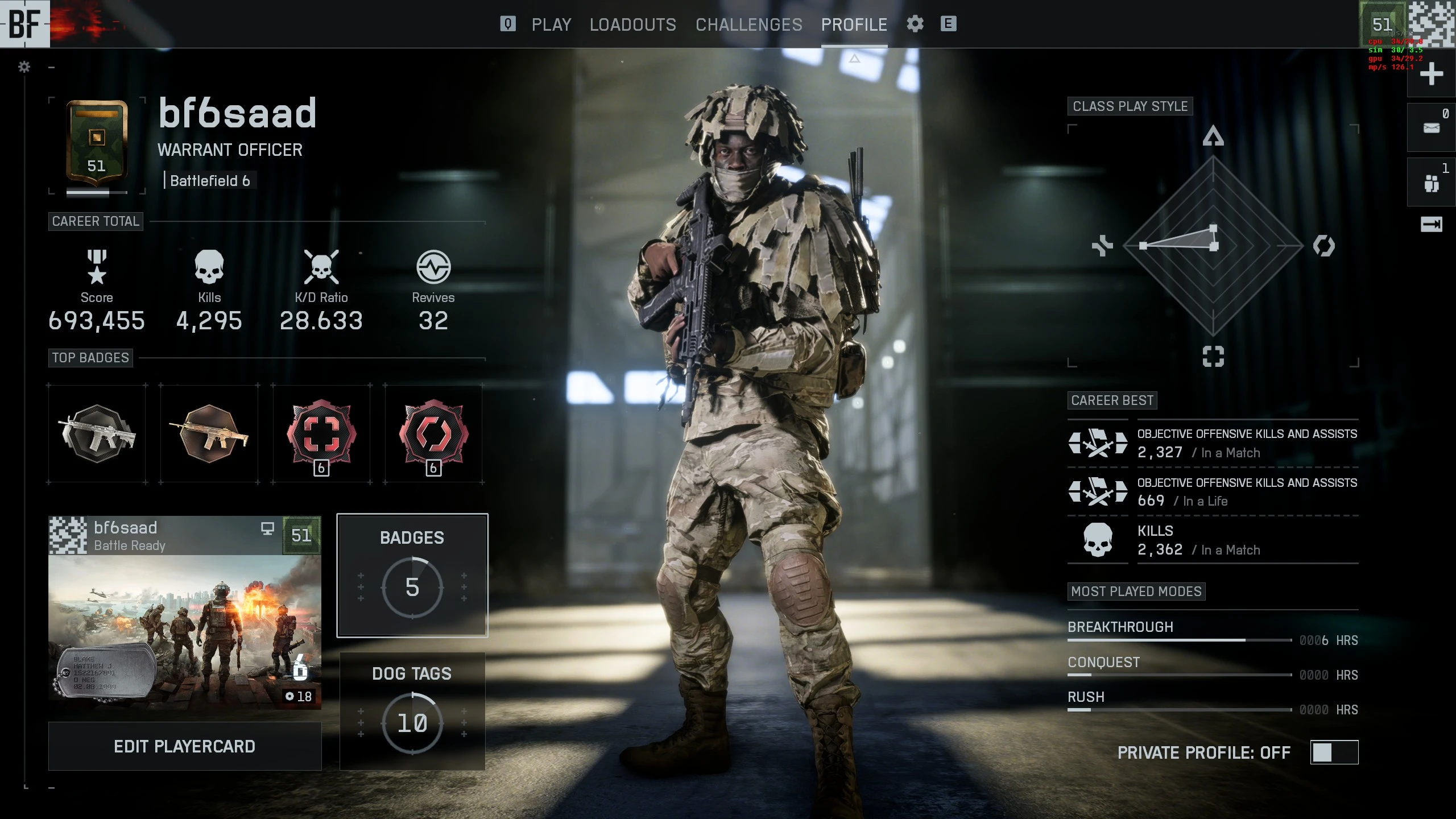 💠 BATTLEFIELD 6 💠 Level 51 💥 1 Silver Gun • 2 Bronze Guns 🪖 All Weapons Unlocked (PSR Sniper) 🎯 All Class Challenges Completed ⚙️ 6 Class + 2 Unit Challenges Done 🧩 Recon, Assault & Engineer Elite Unlocked 👥 All Operators Unlocked 🎮 Steam Edition