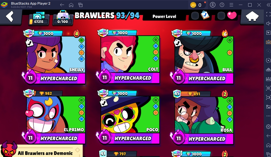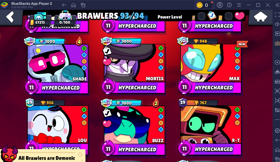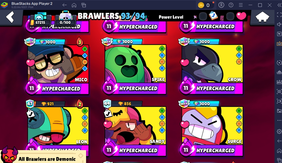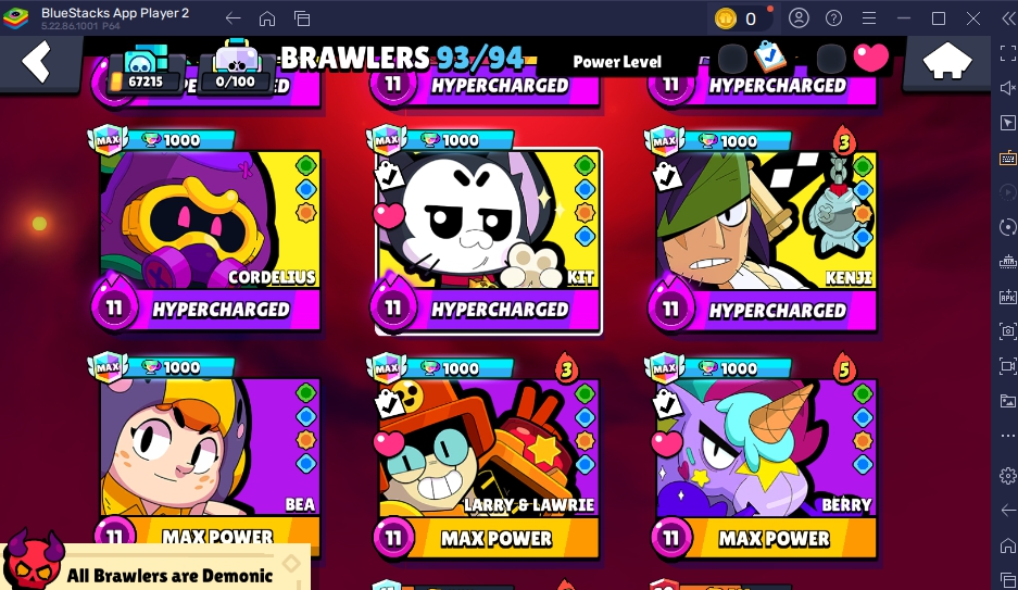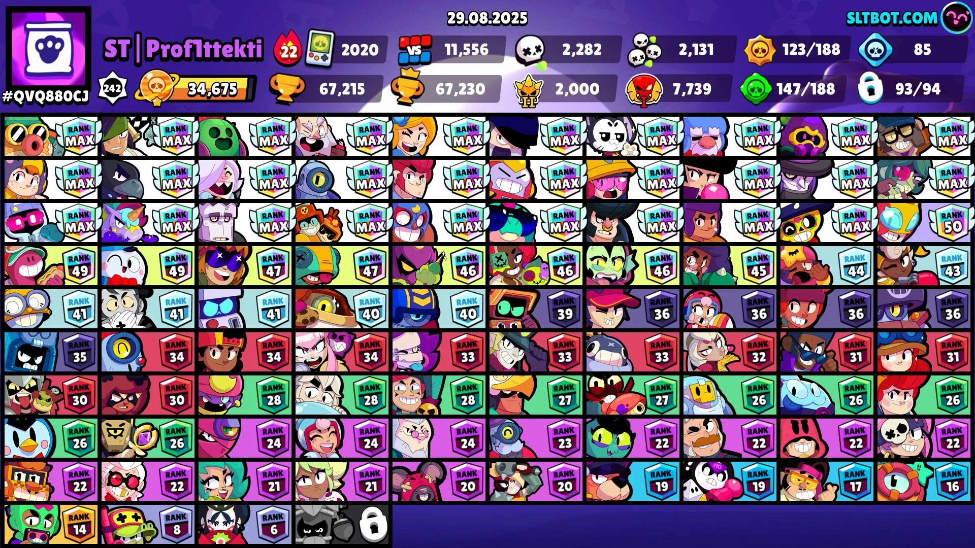11 TITLES â 255 SKINS â 67.200 TROPHY â 93 BRAWLERS â 36 MAX â 33 HYPERCHARGED â KITBOXER â LUNAR PIPER â CURSED KENJI â DIY SURGE â FIRST MATE FANG â DARK LORD SPIKE â LEGENDARY â LEON