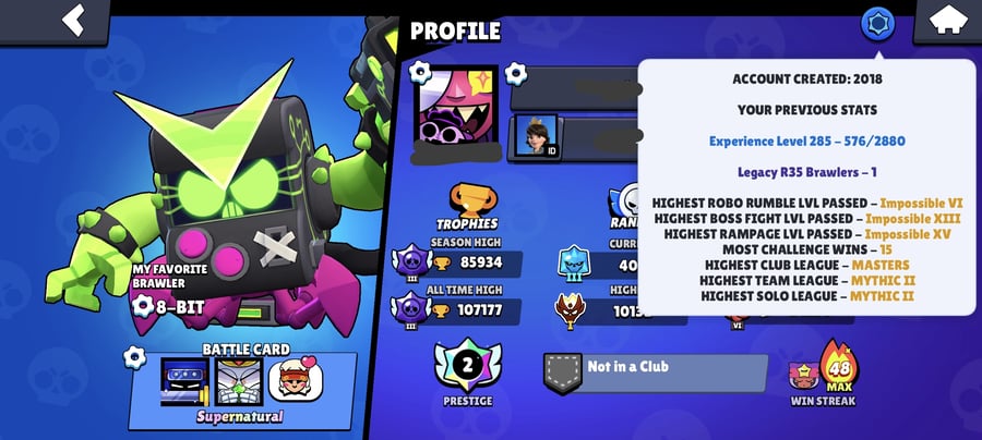 ❄️ 122k Trophies ❄️6x legacy r35 ❄️ 423 Skins ❄️ 7x old Masters ❄️ 194 Epic ❄️ 2x new Masters ❄️ Meteoric Fame 2 ❄️ 94 Maxed ❄️