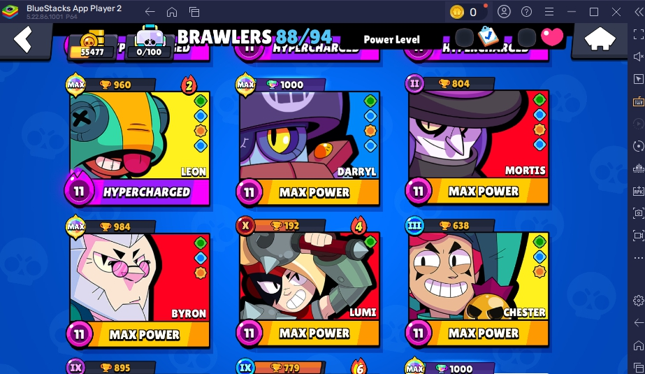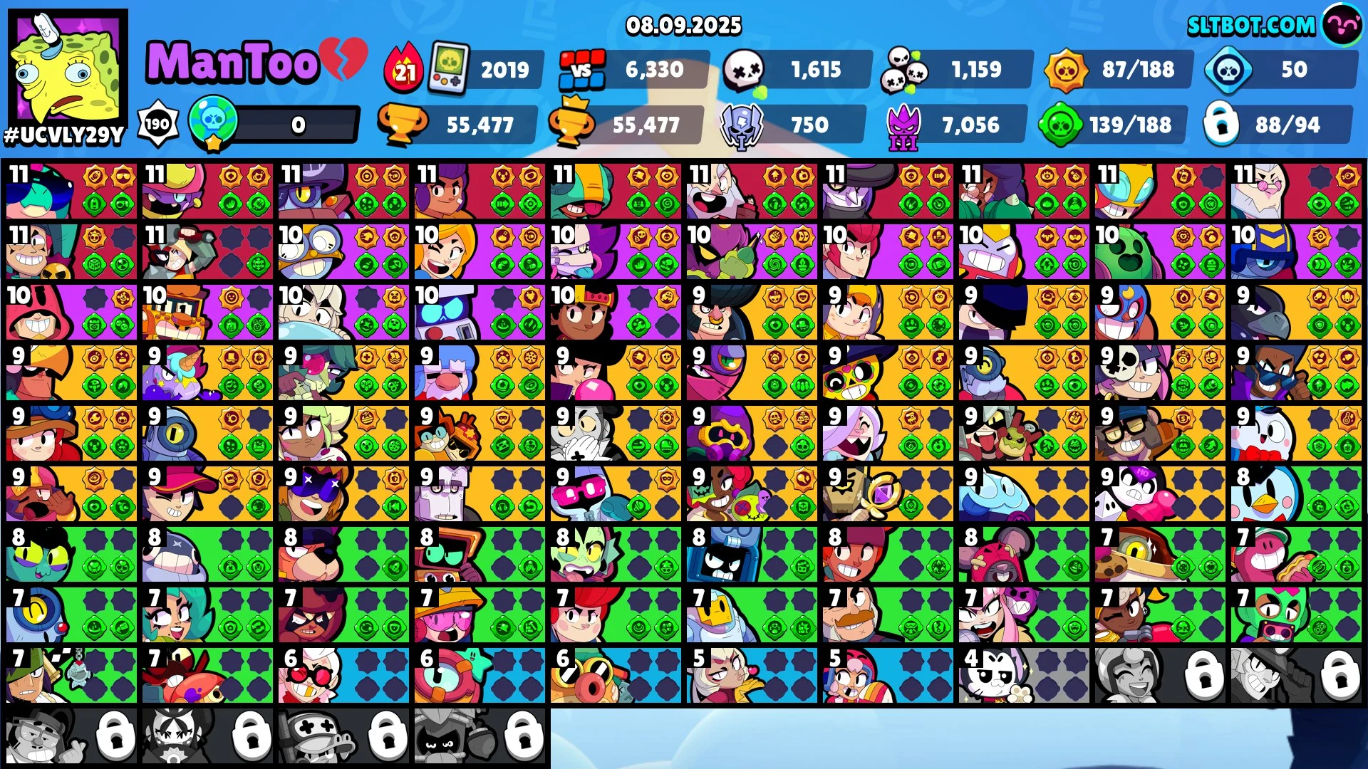 199 SKINS â 55.500 TROPHY â 88 BRAWLERS â 12 MAX â 7 HYPERCHARGED â CAPTAIN CARL â FINAL BOSS RICO â IMPIE COLETTE â KRAKEN SURGE â FANGUARD FANG â SPIKE â LEGENDARY â LEON