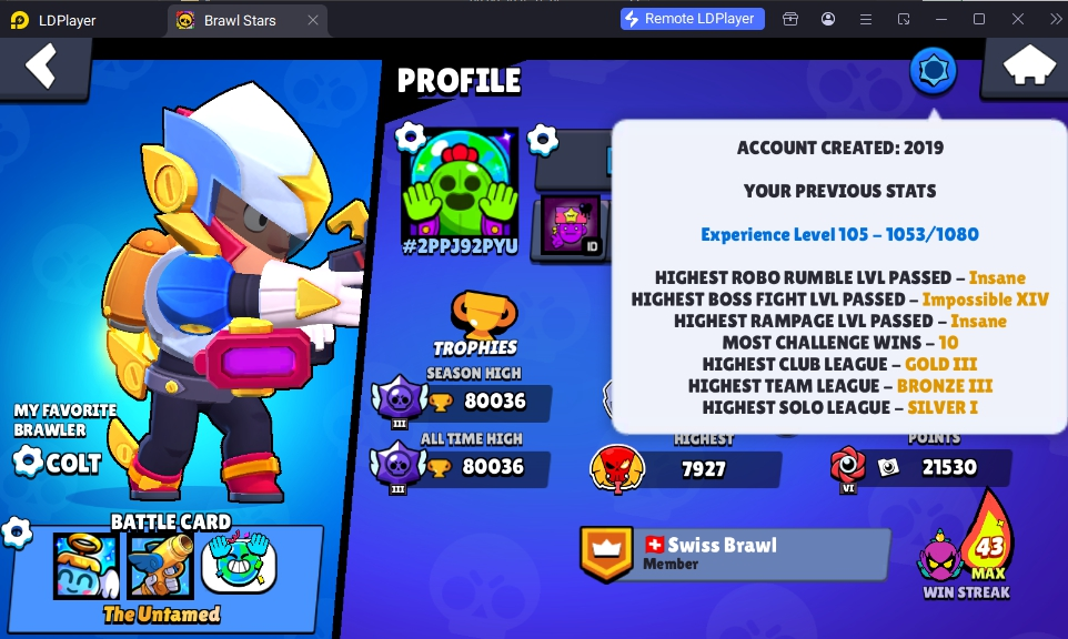 279 SKINS 💯 80.032 TROPHIES 🏆 95 BRAWLERS 🐼 28 HYPERCHARGED 🩸 30 MAX BRAWLERS 💛 LAMBENT MORTIS 🧡 ONI KENJI 🧡 UNO CHESTER 🧡 TRUANT PENNY 🧡 UDERWORLD BO  💯