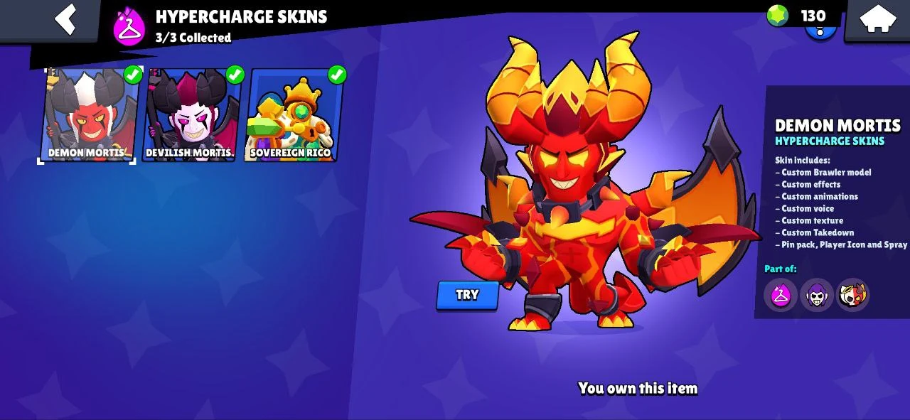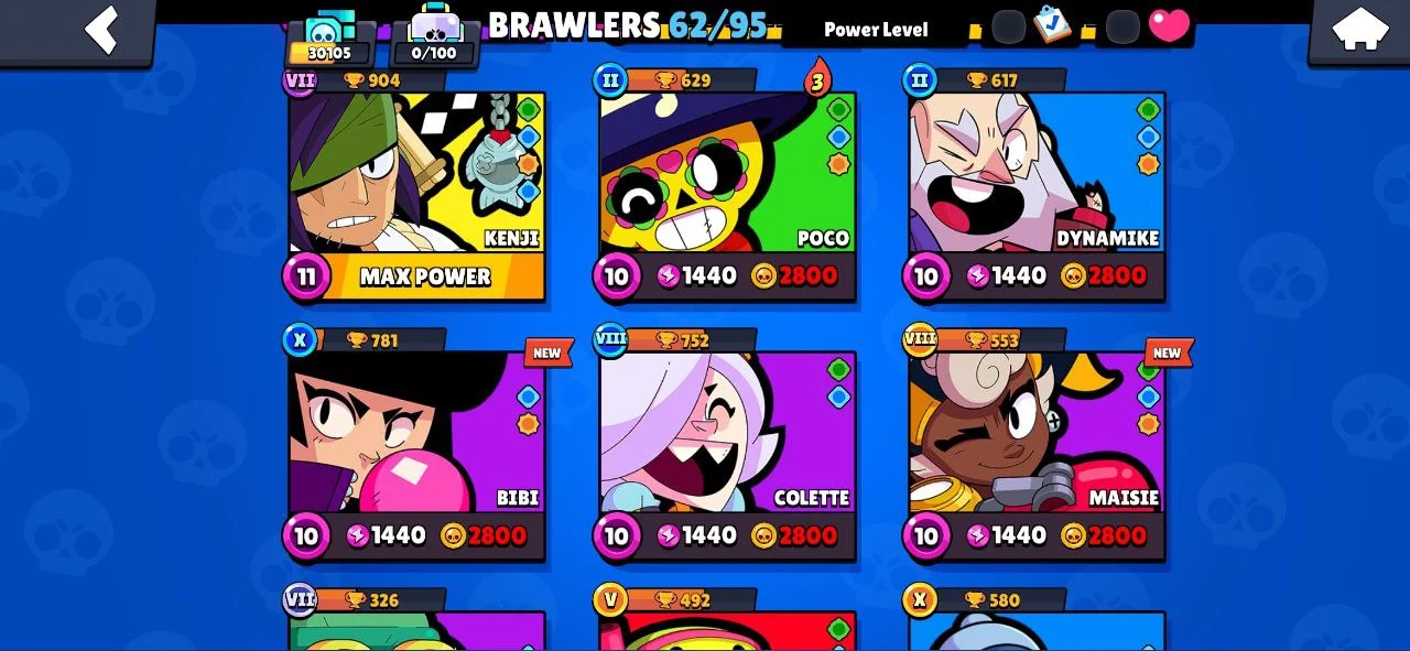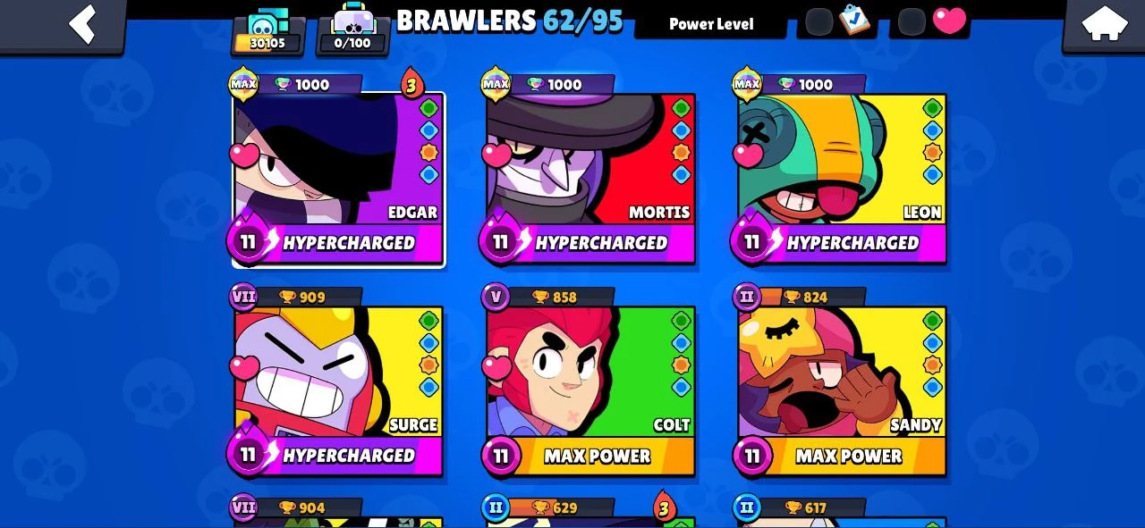 ⭐ 62 BRAWLERS 🎯 7 MAX BRAWLERS 🐼 4 HYPERCHARGED 🎯 30105 TROPHIES 🧥 121 SKINS 🔵 DEMON MORTIS 🔵 SURGE LIGHTYEAR 🔐 FULL ACCESS