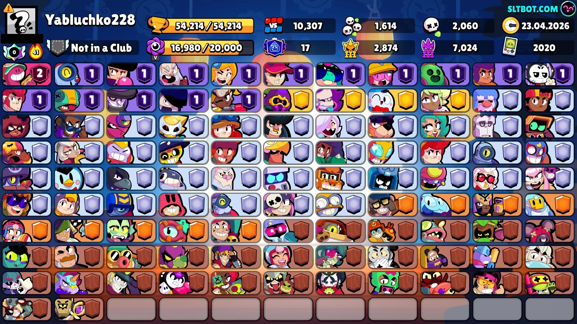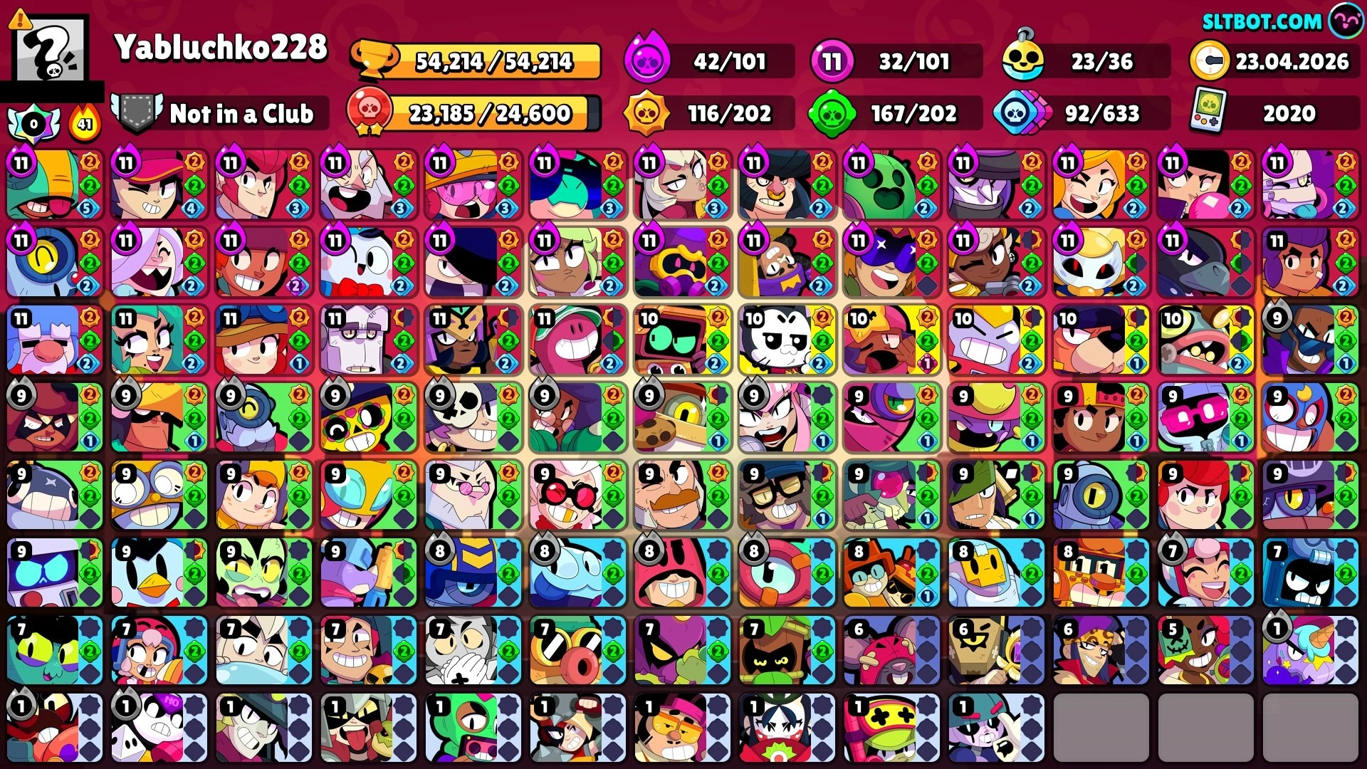DOUG 2 PRESTIGE ⭐ 11.11 PIN ⭐ 234 SKINS ⭐ 54.200 TROPHY ⭐ 101 BRAWLERS ⭐ 26 HYPERCHARGED ⭐ 32 MAXED BRAWLERS ⭐ 17 PRESTIGE ⭐ 23 BUFFIES ⭐ BANANAS COLT ⭐ CUPID PIPER ⭐ BUZZETTE ⭐ MAGMA MANDY ⭐ YETI SAM ⭐ LEGENDARY ⭐ 50K
