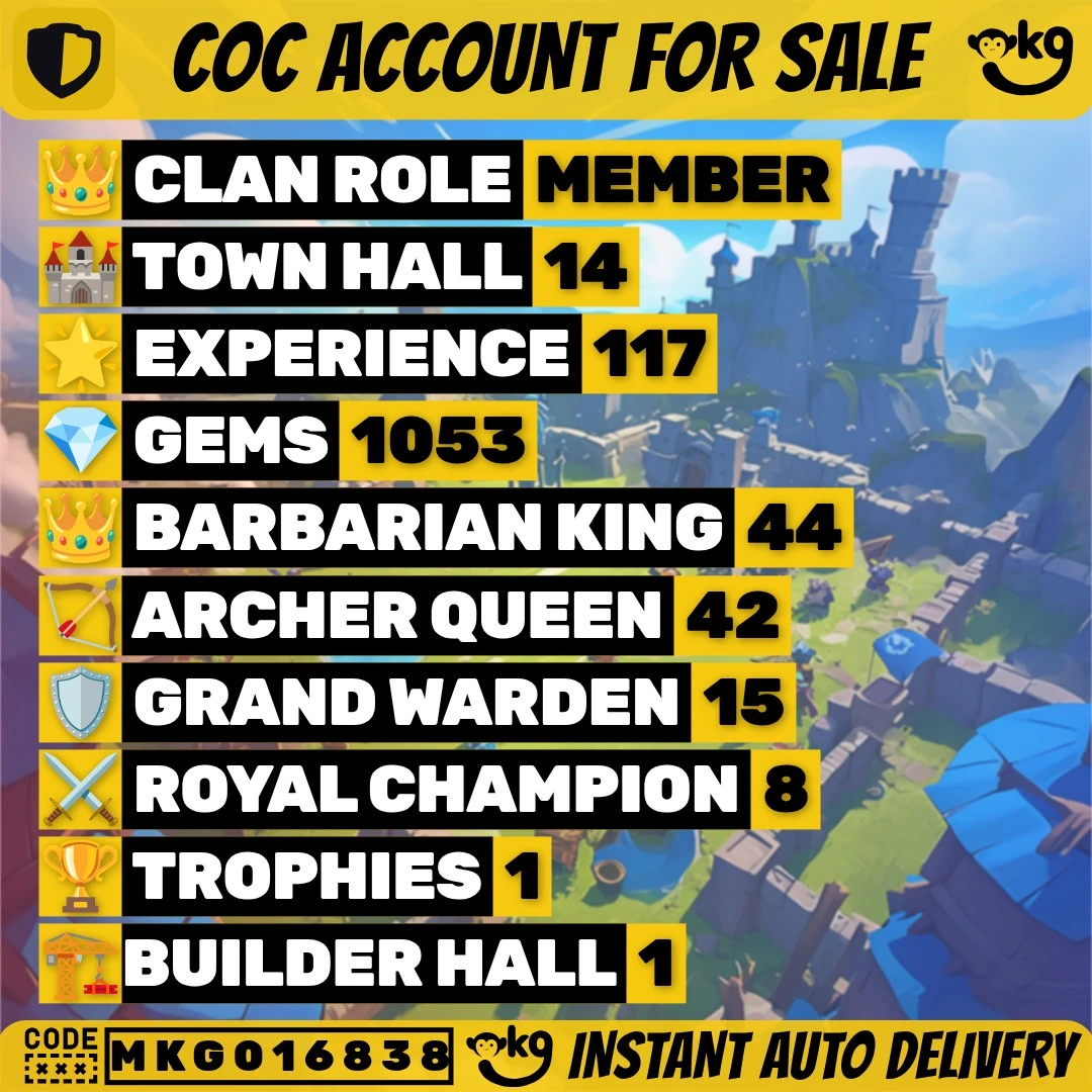 🏰 TH14 🛡️ Nice Defence | 💎 1,053 Gems | 📈 Lvl 117 | 🦸♂️ Heroes 44/42/16/15/8 | 👕 2 Skins | ⚔️ 4 Epic Eq. | 💰 Nc Free | 📱 Android/iOS | 🆔 M3754 !MKG016838