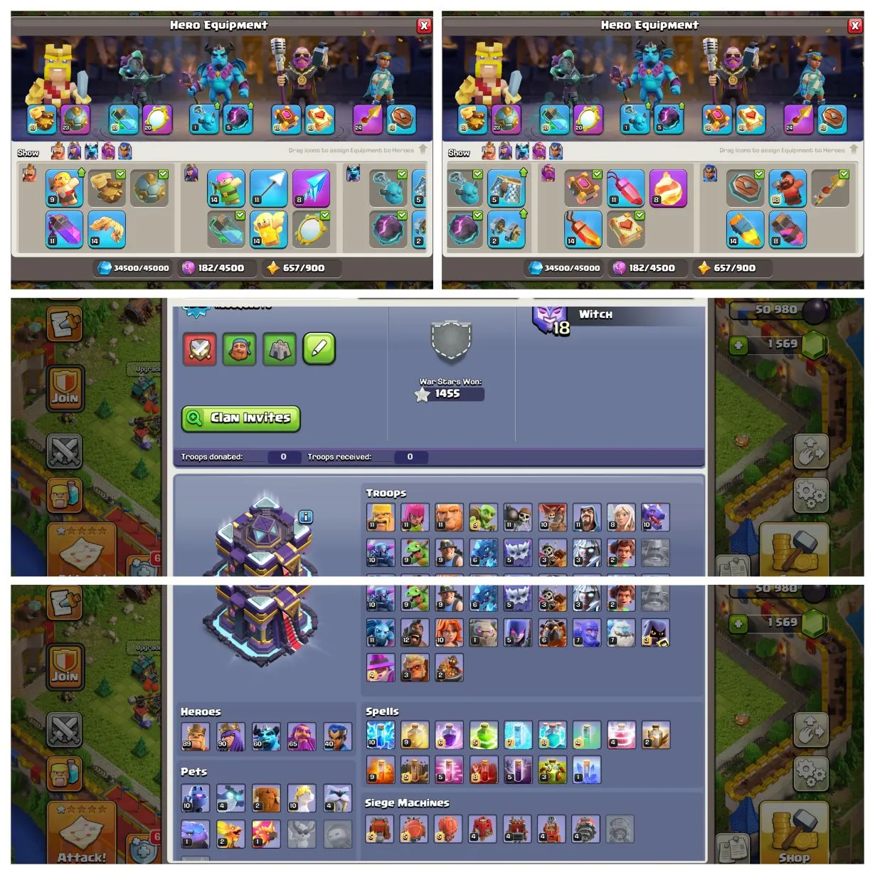 [Max Heros:90-90-60-65-40] 🌟Th15 Max 100%🌟[Defence+Wall Max 100%]🌟World Best Equipment Max🌟Rare Scenery+Skins🌟Full Access🌟(T725)