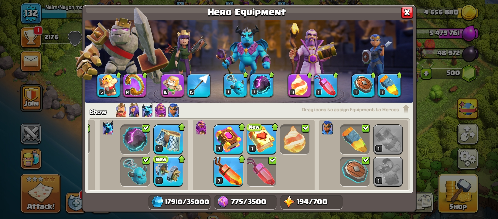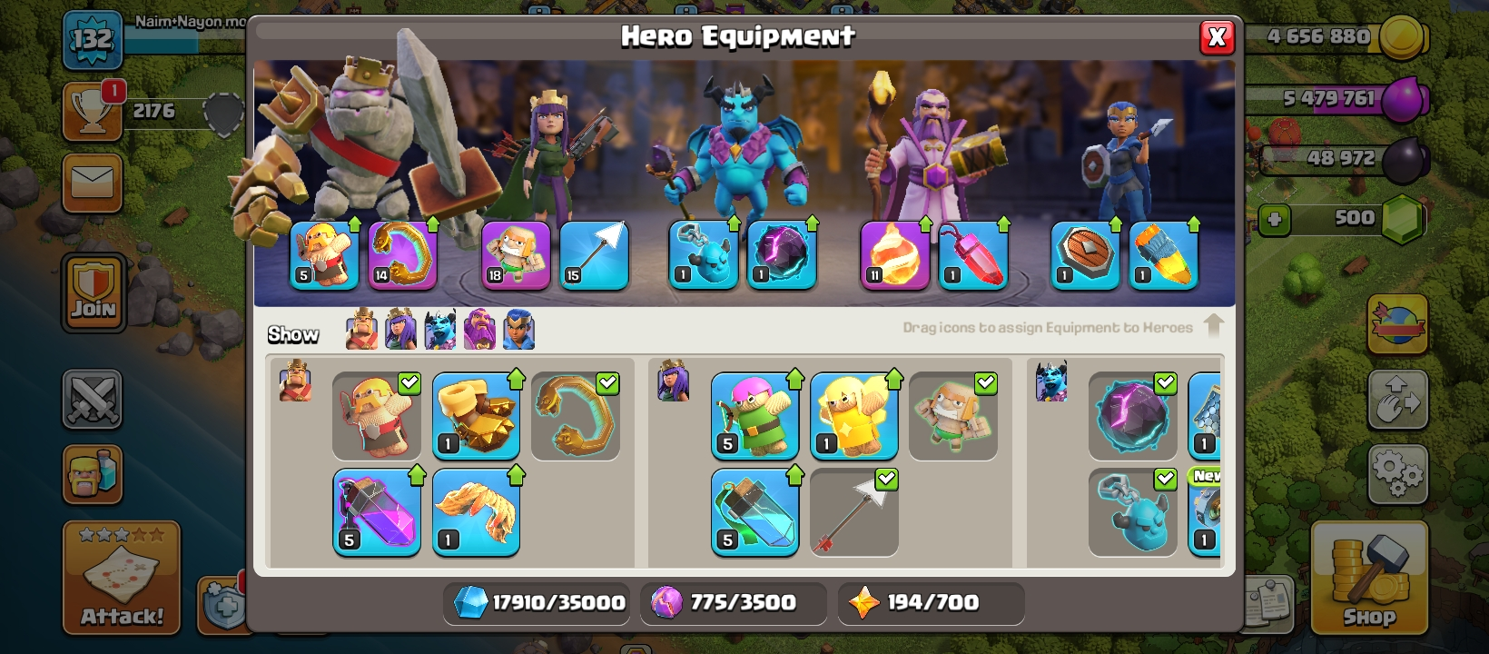TH13 YOUNG PLAYER ACCOUNT !! XP133 !! HEROS 47-48-36-20-8 !! 3X EQUIPMENT AND NAME CHANGE 500 GAMES