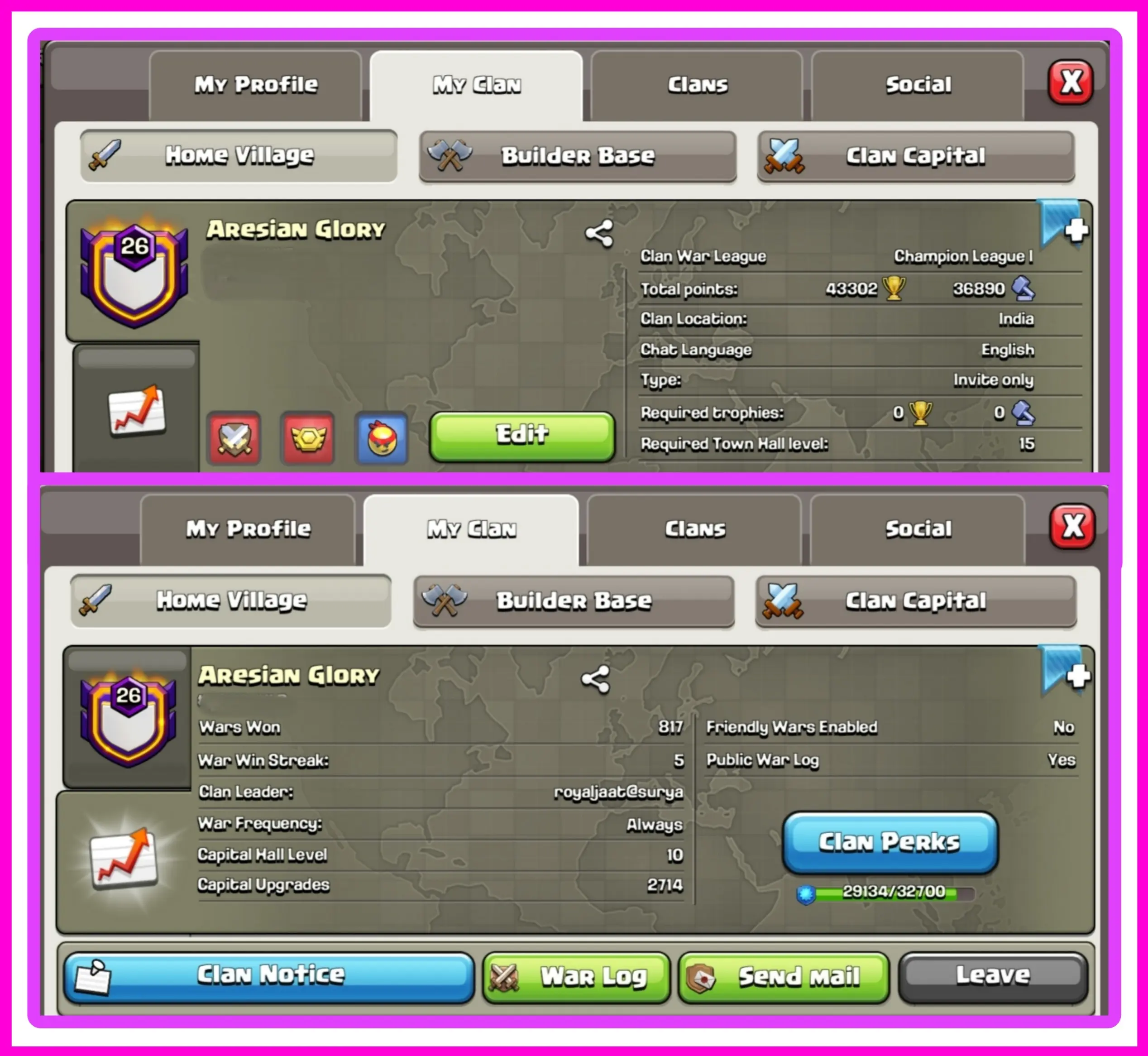 OP ENGLISH NAME 🔥LVL 26🔥 ARESIAN GLORY 🔥817:167 WAR LOG 🔥 CHAMPION 1🔥 ENGLISH NAME 🔥CC 10 🔥