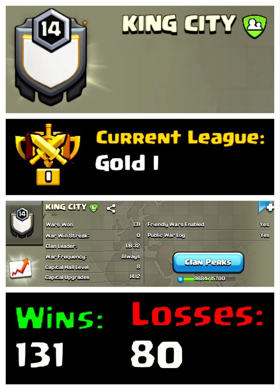❤️🔥OP LEVEL 14 ENGLISH CLAN 🏆 OP NAME : KING CITY ☘LEAGUE : GOLD 1🏀 CLAN CAPITAL : 8🏆WINS : 131 | LOSS : 80💫 BEST CLAN BUY NOW ⭐️ FAST DELIVERY🚚
