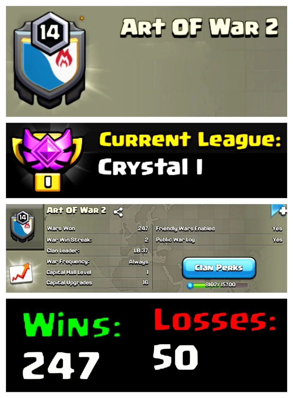 ❤️🔥OP LEVEL 14 ENGLISH CLAN ☢ OP NAME : ART OF WAR🥵LEAGUE : CRYSTAL 1🥶 CPALAN CAPITAL : 1✴️WINS : 247 | LOSS : 50♠️ BEST CLAN BUY NOW 🛑FAST DELIVERY🚚