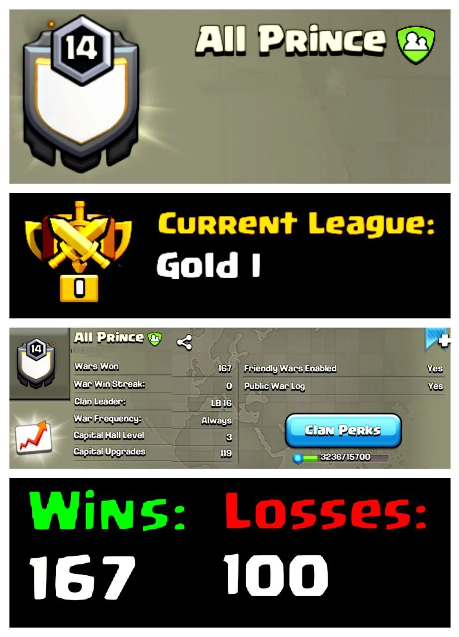 ✔️OP LEVEL 14 ENGLISH CLAN ♣️ OP NAME :ALL PRINCE ❤️🔥LEAGUE :GOLD 1♻️ CLAN CAPITAL : 3✴️WINS : 167| LOSS : 100♠️ BEST CLAN BUY NOW 🛑FAST DELIVERY🚚