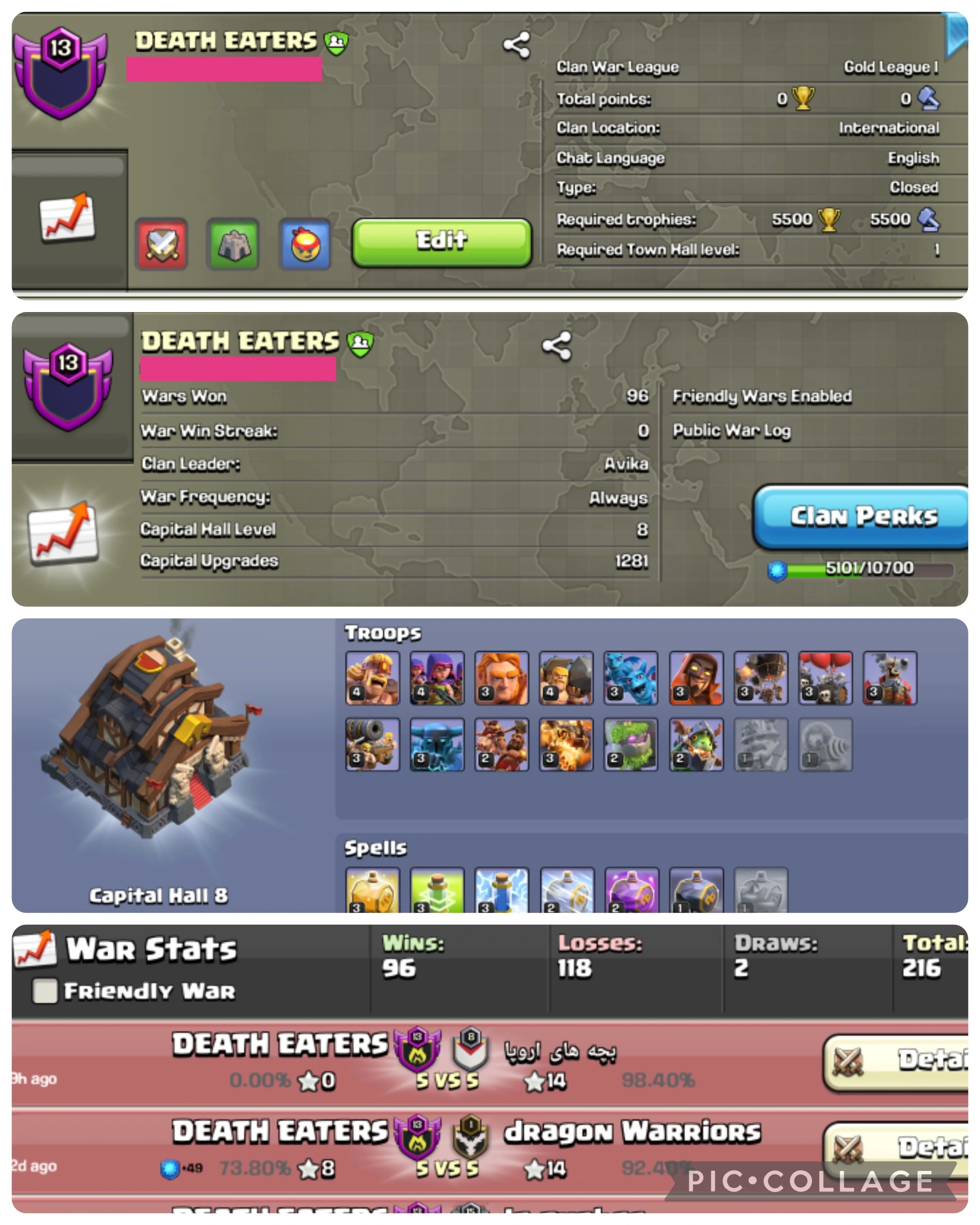 âšïžLEVEL : 13 + CC 8 â€ïž NAME : DEATH EATERS đ«¶ GOLD 1 đŁ WARLOG W-L-D : 96-118-2