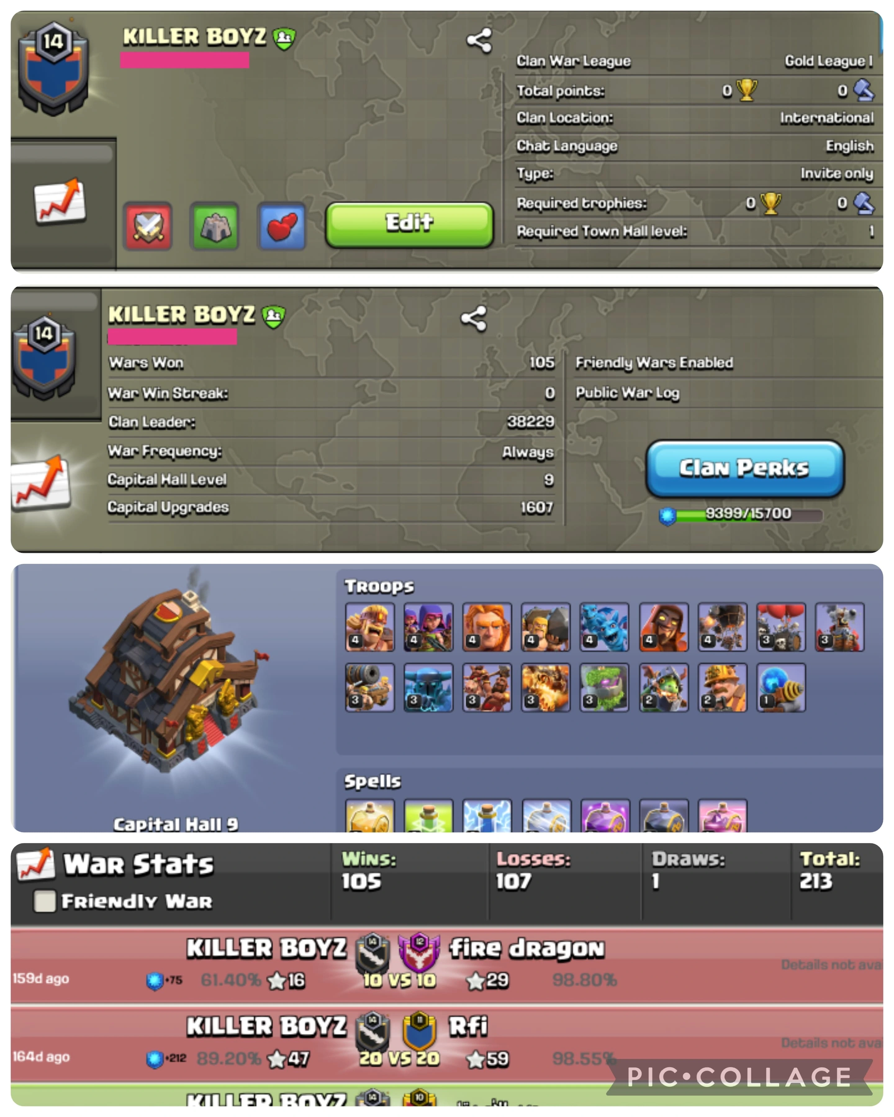 đ€©NAME : KILLER BOYZ đ€ CC : 9 đ LEVEL : 14.8 âșïž GOLD 1 đ€ 105 WINS 107 LOSSES 1 DRAWS 213 TOTAL đ€«