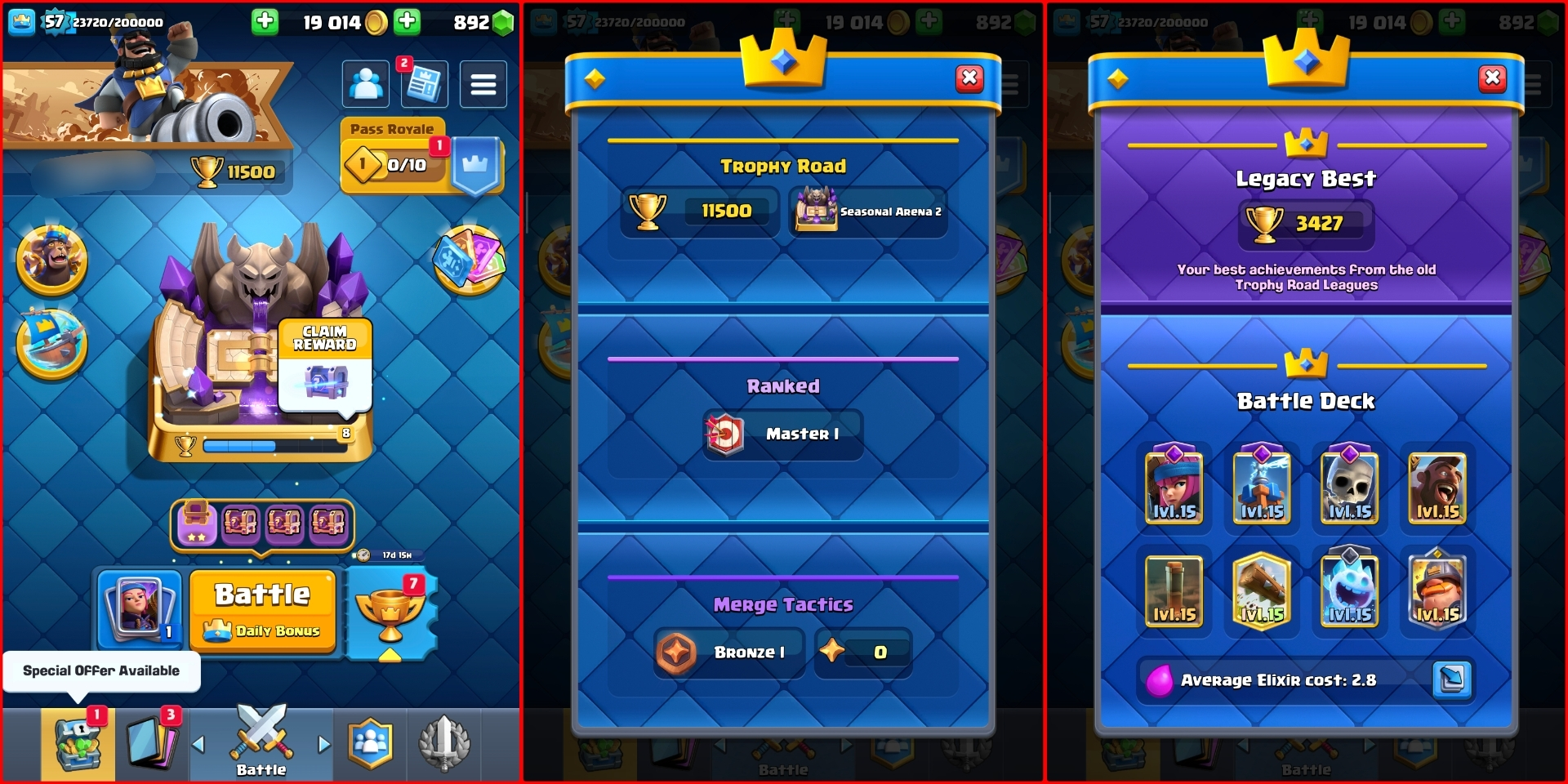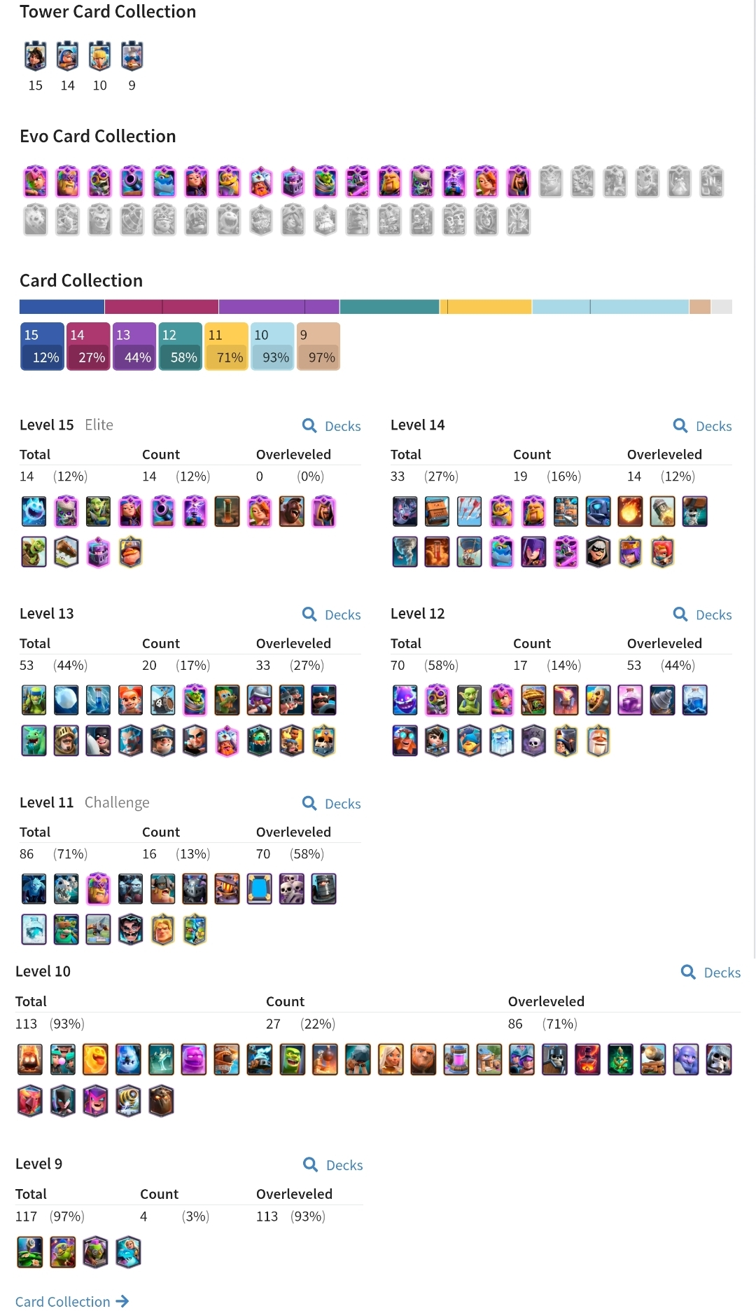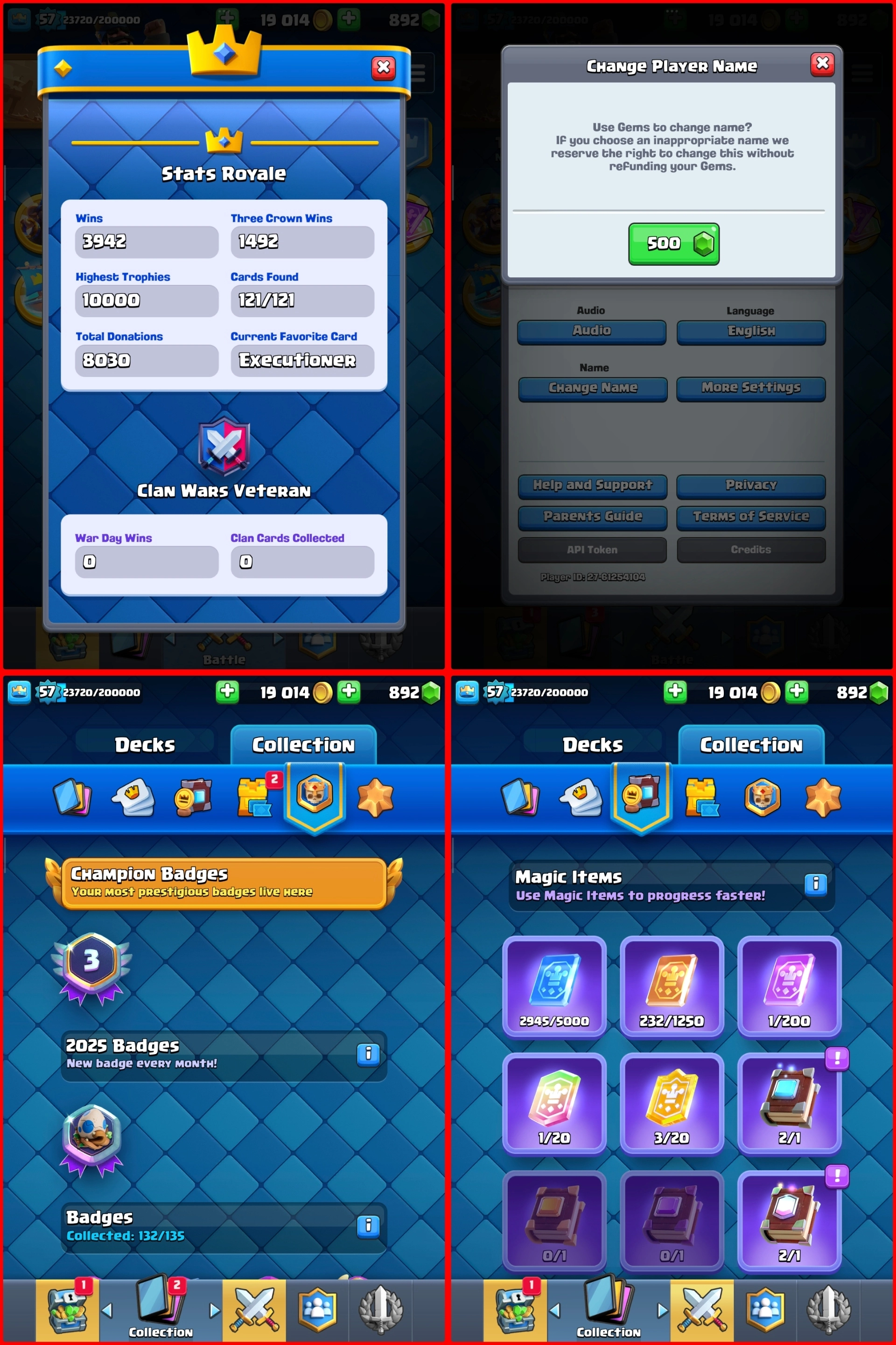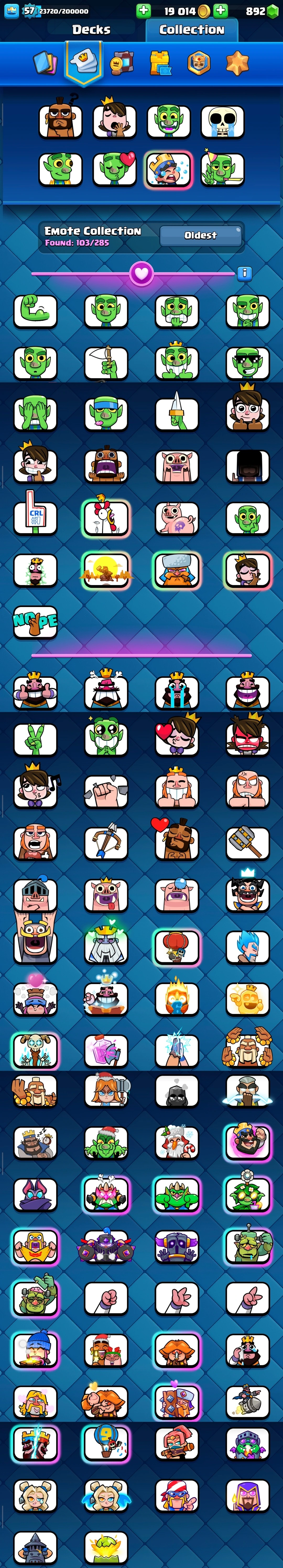 11500 Trophy, Level 57 | 121 ALL Cards + Low 500 NC | 16 Evolutions, 19 Cards Max Level 14 & 14 Level 15 | 20 Level 13, 103 Emotes | RC11