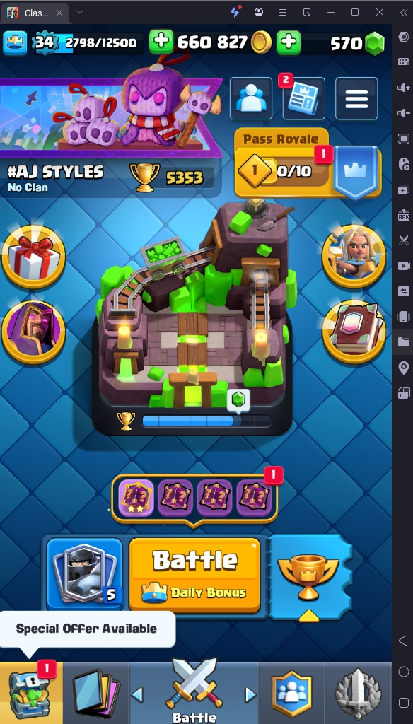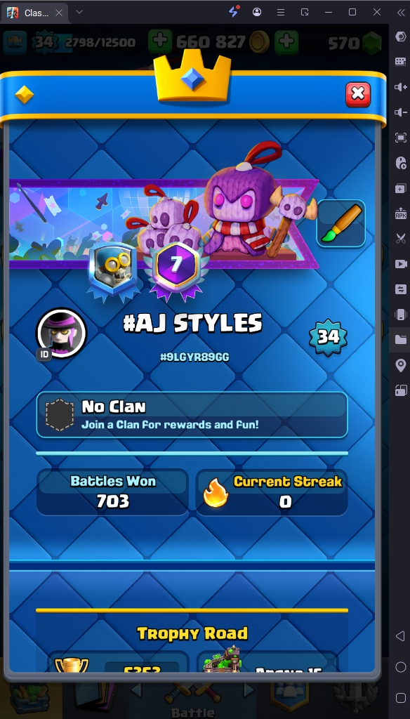 5353 TROPHY 🏆 34 LVL 💯 KT 12 👑 107 CARDS ♦️ 1 MAX CARDS 👑 0 ELITE CARDS 🔮 0 EVO 💯 EMOTE 20 🎭 #9LGYR89GG ⸱ TAG ACCOUNT ♥️