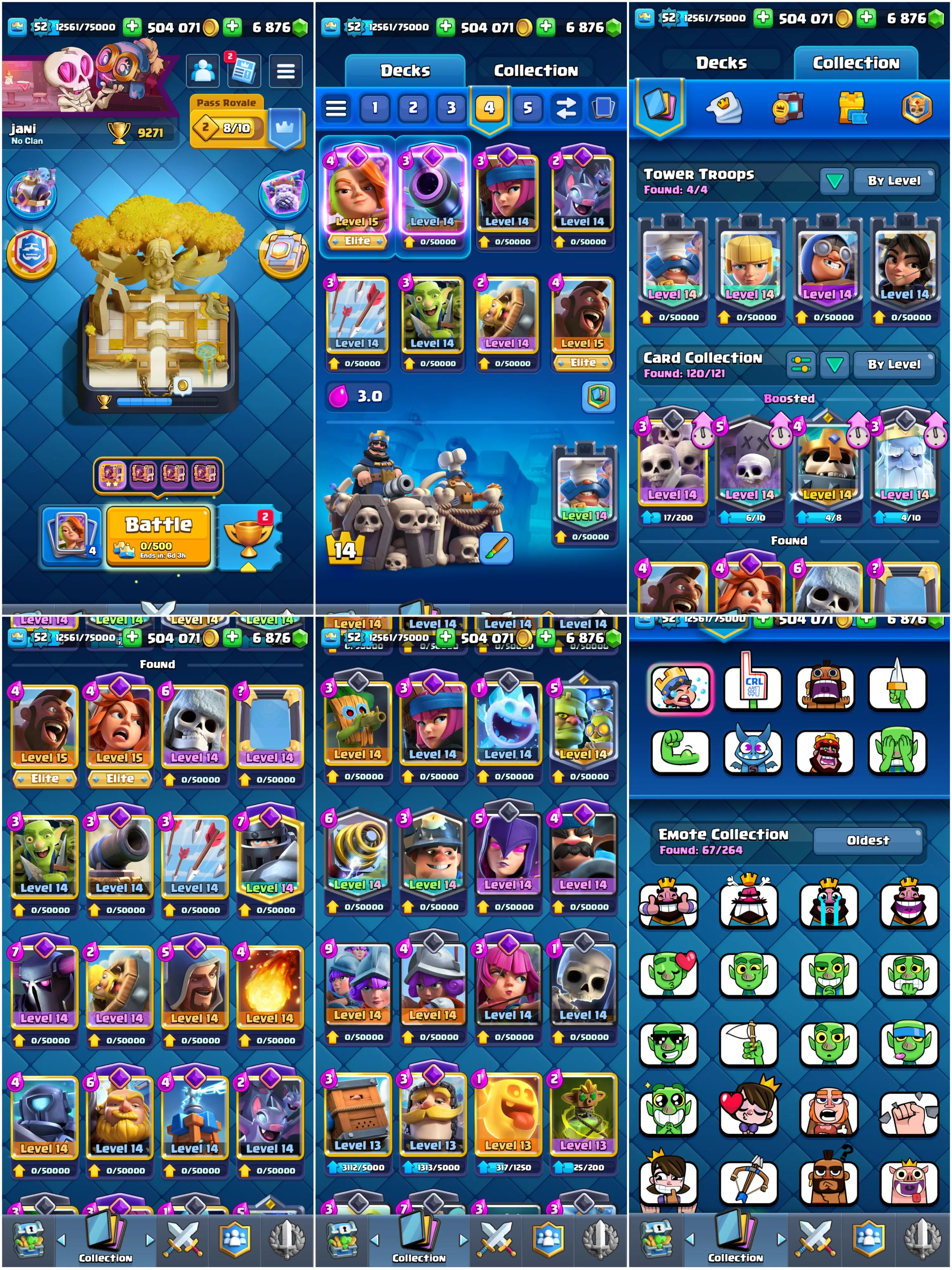 💎 {6,800+ Gems} • Level 52 + KT 14 🎯 9,200+ Trophies • 28 Max Cards • 2 Elites • 16 Evolutions ✨ 67 Emotes • 6 Tower Skins